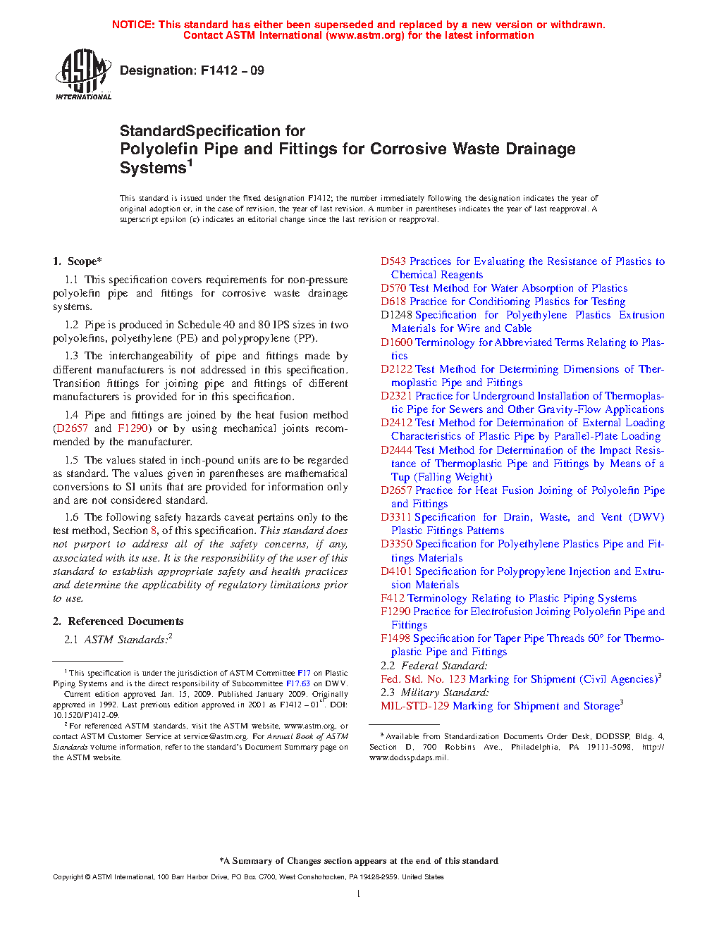 1.1 This specification covers requirements for non-pressure polyolefin pipe and fittings for corrosive waste drainage systems.