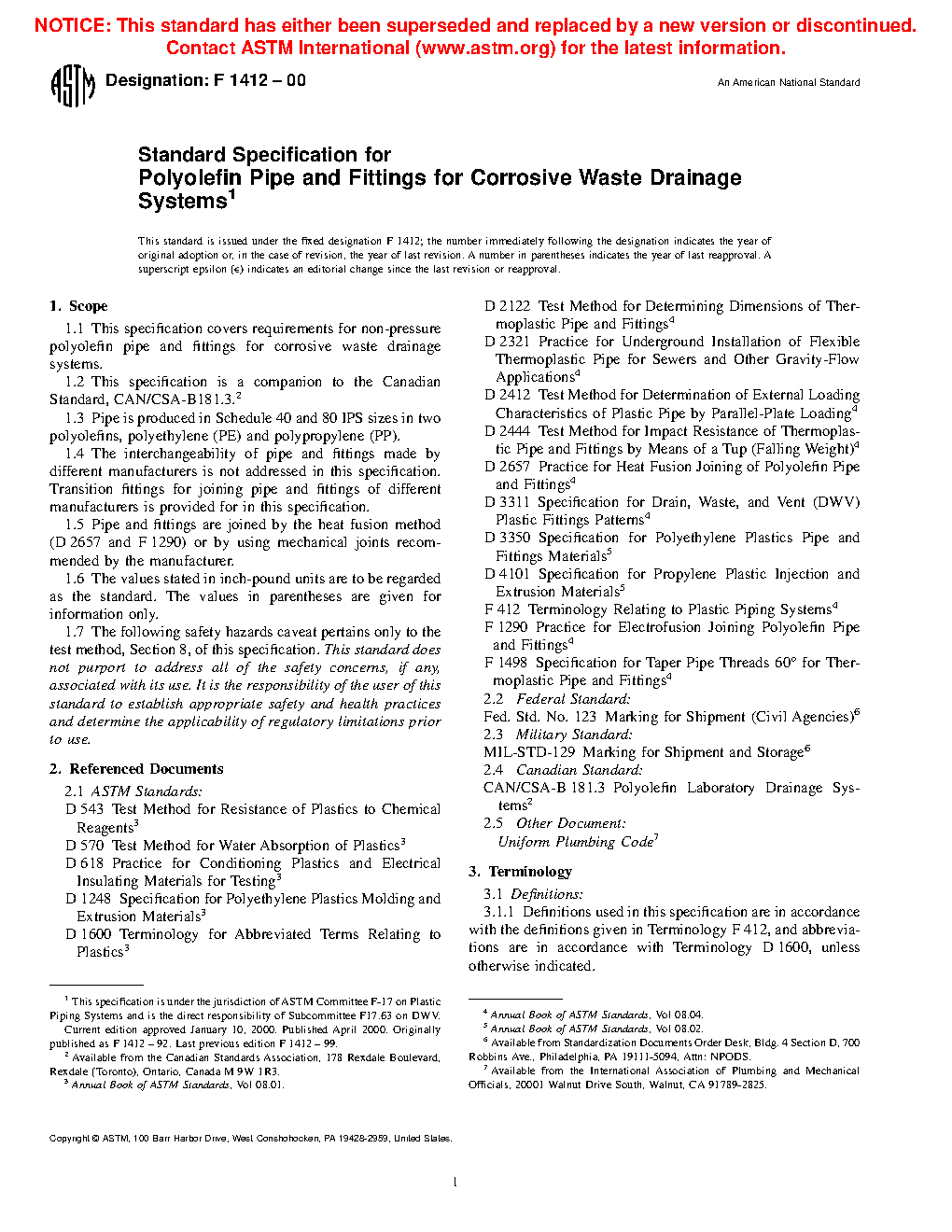 This specification covers the requirements for non-pressure polyolefin pipe and fittings for corrosive waste drainage systems. The pipe is produced in Schedule 40 and 80 IPS sizes in two polyolefins (polyethylene and polypropylene) that shall contain suitable stabilizers and antioxidants and may contain pigments and fillers not detrimental to the pipe and fittings. The specimens shall conform to the outside diameter; wall thickness; average waterway diameter; chemical resistance to acetic acid, acetone, methyl alcohol, ammonium hydroxide, nitric acid, and sodium hydroxide; water absorption; system integrity; flattening; and impact resistance requirements. Hydrostatic pressure tests shall be conducted on both the heat-fused and mechanical joints.