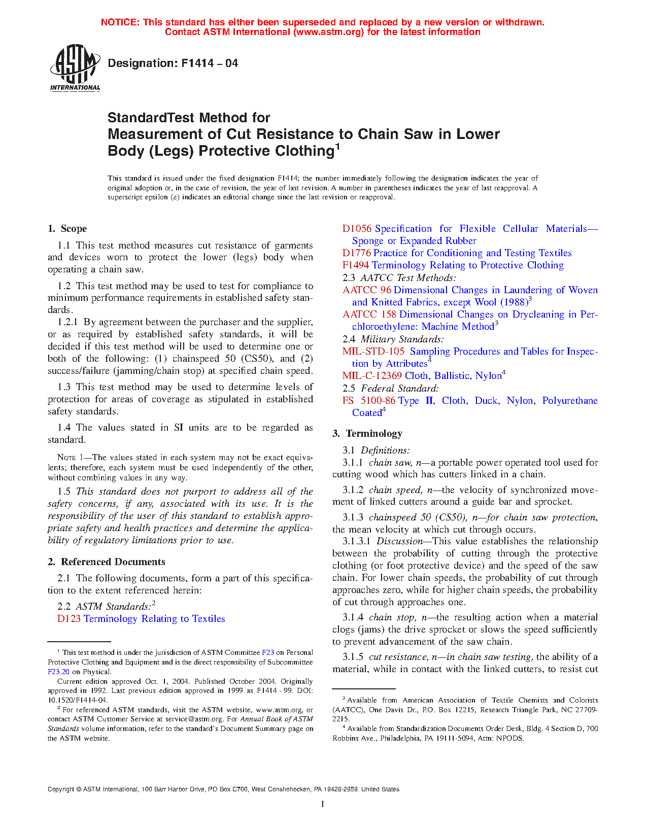 1.1 This test method measures cut resistance of garments and devices worn to protect the lower (legs) body when operating a chain saw.