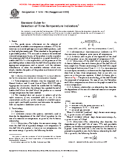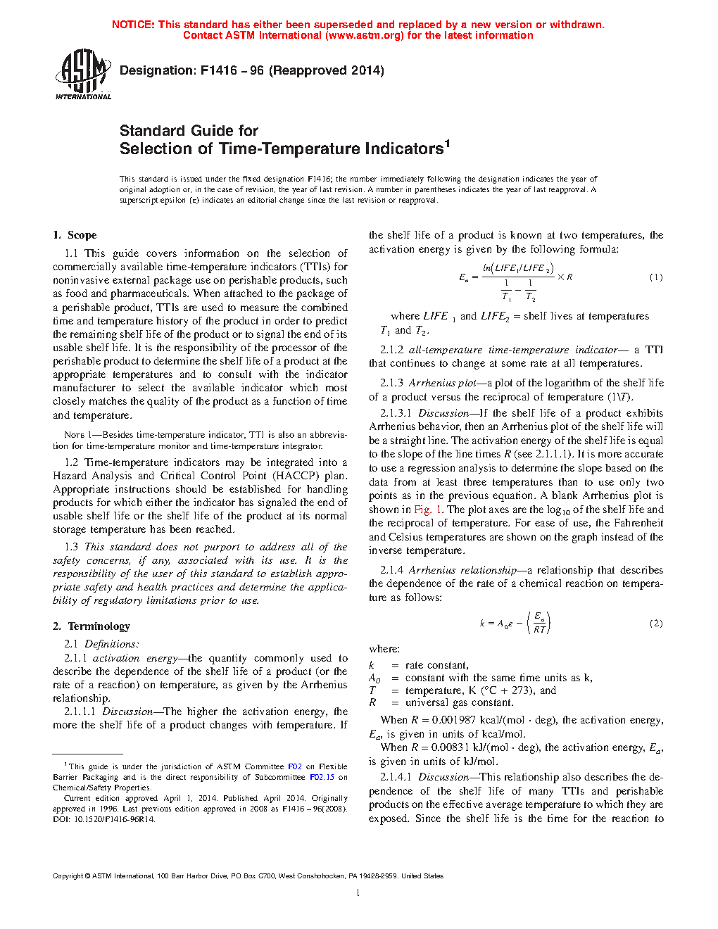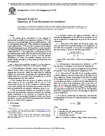 1.1 This guide covers information on the selection of commercially available time-temperature indicators (TTIs) for noninvasive external package use on perishable products, such as food and pharmaceuticals. When attached to the package of a perishable product, TTIs are used to measure the combined time and temperature history of the product in order to predict the remaining shelf life of the product or to signal the end of its usable shelf life. It is the responsibility of the processor of the perishable product to determine the shelf life of a product at the appropriate temperatures and to consult with the indicator manufacturer to select the available indicator which most closely matches the quality of the product as a function of time and temperature.