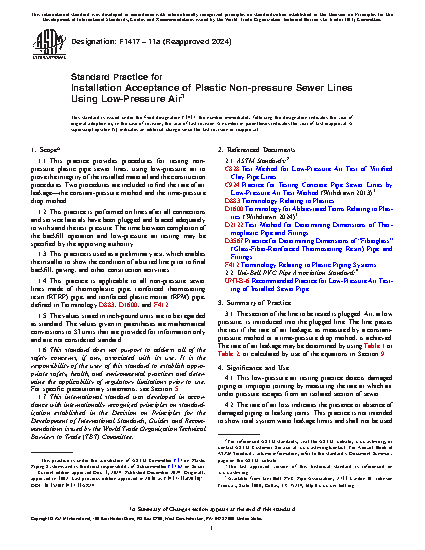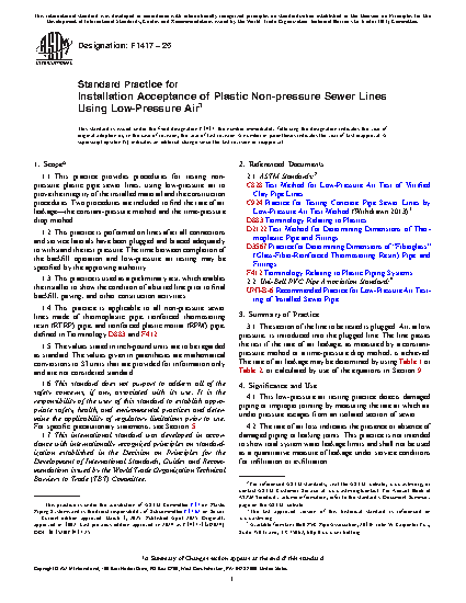 1.1 This practice provides procedures for testing non-pressure plastic pipe sewer lines, using low-pressure air to prove the integrity of the installed material and the construction procedures. Two procedures are included to find the rate of air leakage—the constant-pressure method and the time-pressure drop method.