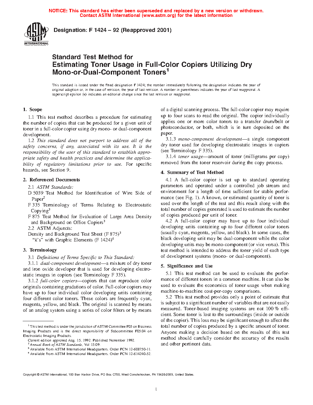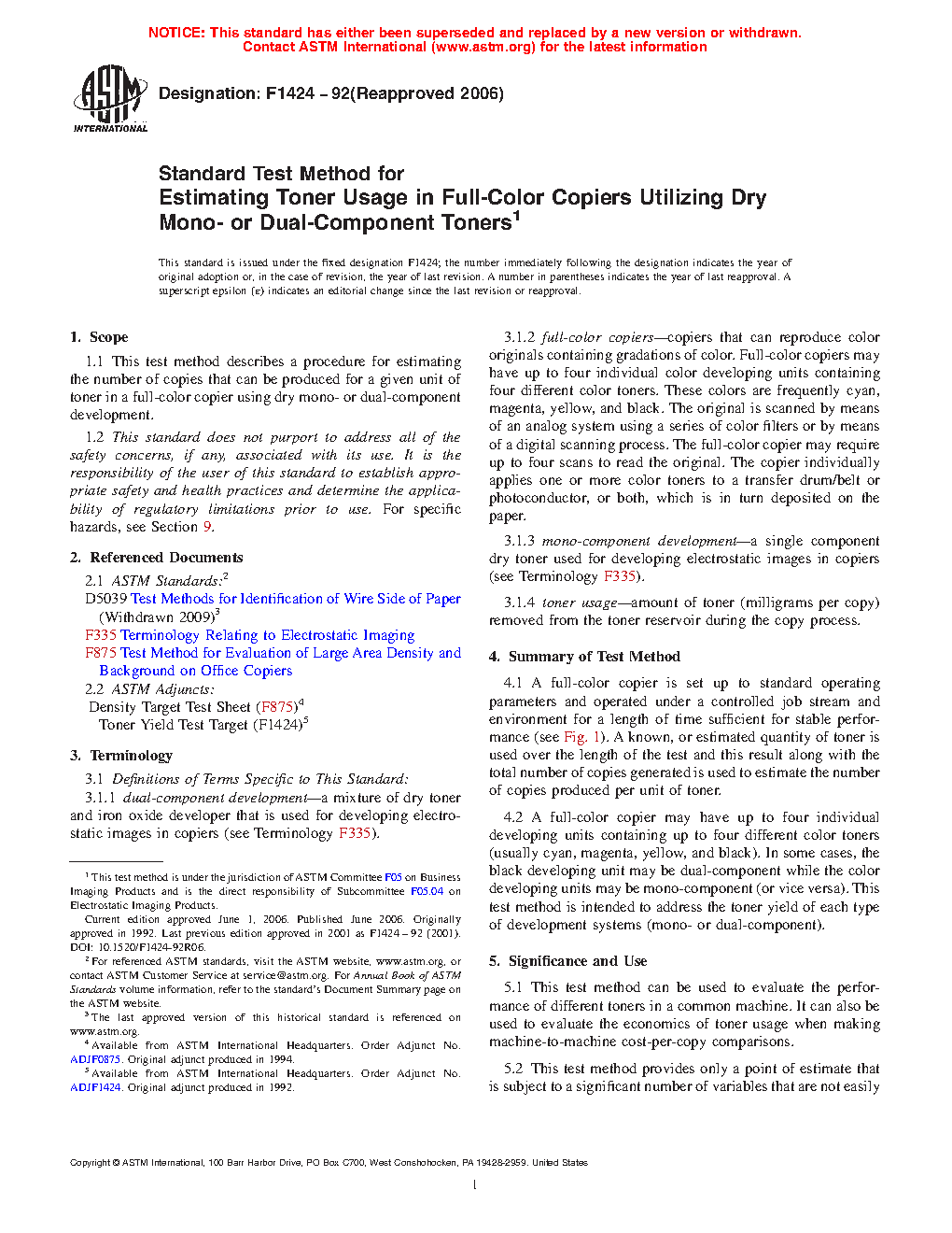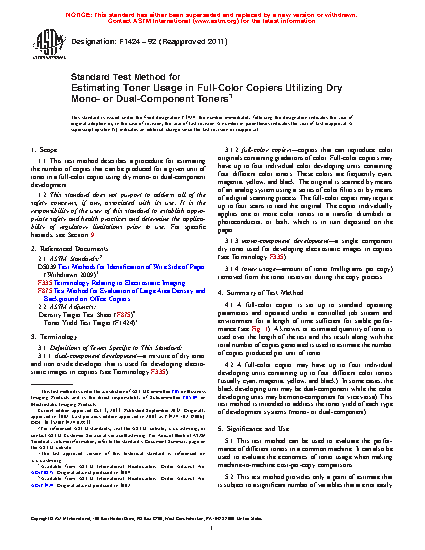 1.1 This test method describes a procedure for estimating the number of copies that can be produced for a given unit of toner in a full-color copier using dry mono- or dual-component development.