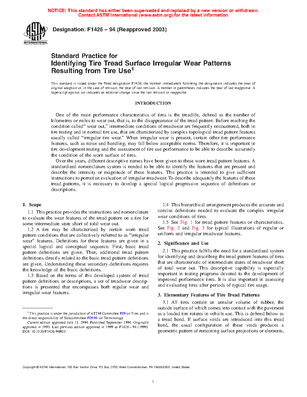 3.1 This practice fulfills the need for a standardized system for identifying and describing the tread pattern features of tires that are characteristic of intermediate states of treadwear short of total wear out. This descriptive capability is especially important in testing programs devoted to the development of improved performance tires. It is also important in assessing and evaluating tires after periods of typical tire usage.