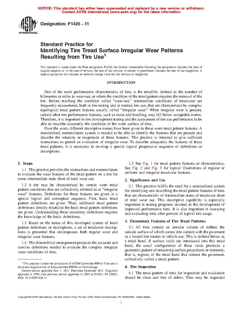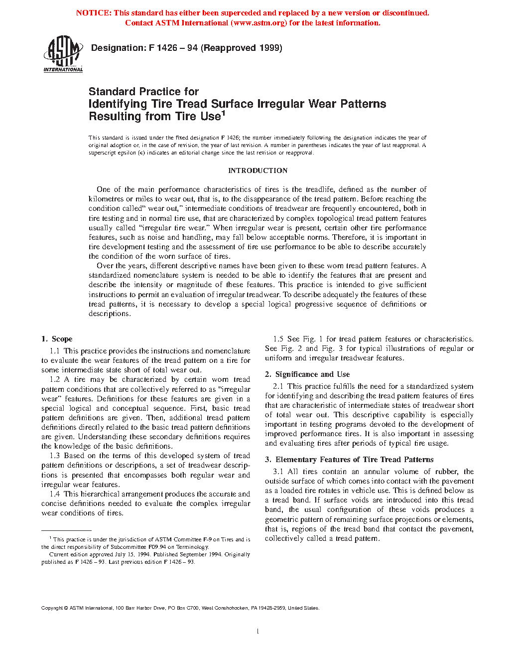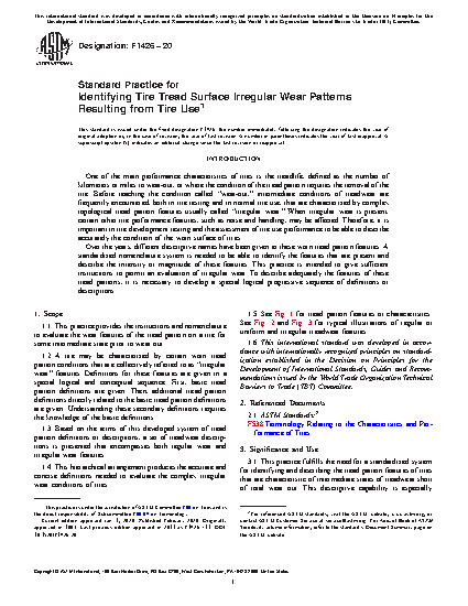 1.2 A tire may be characterized by certain worn tread pattern conditions that are collectively referred to as "irregular wear" features. Definitions for these features are given in a special logical and conceptual sequence. First, basic tread pattern definitions are given. Then additional tread pattern definitions directly related to the basic tread pattern definitions are given. Understanding these secondary definitions requires the knowledge of the basic definitions.