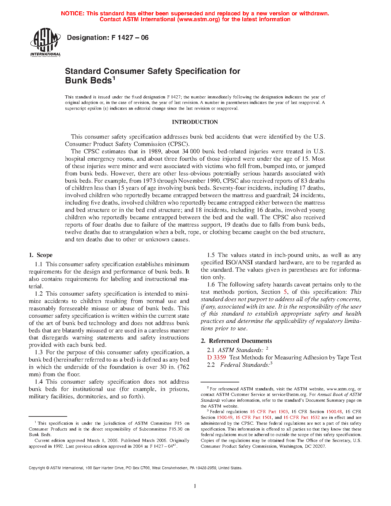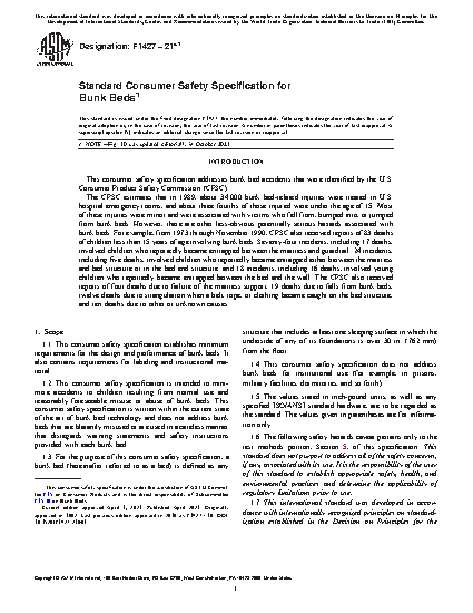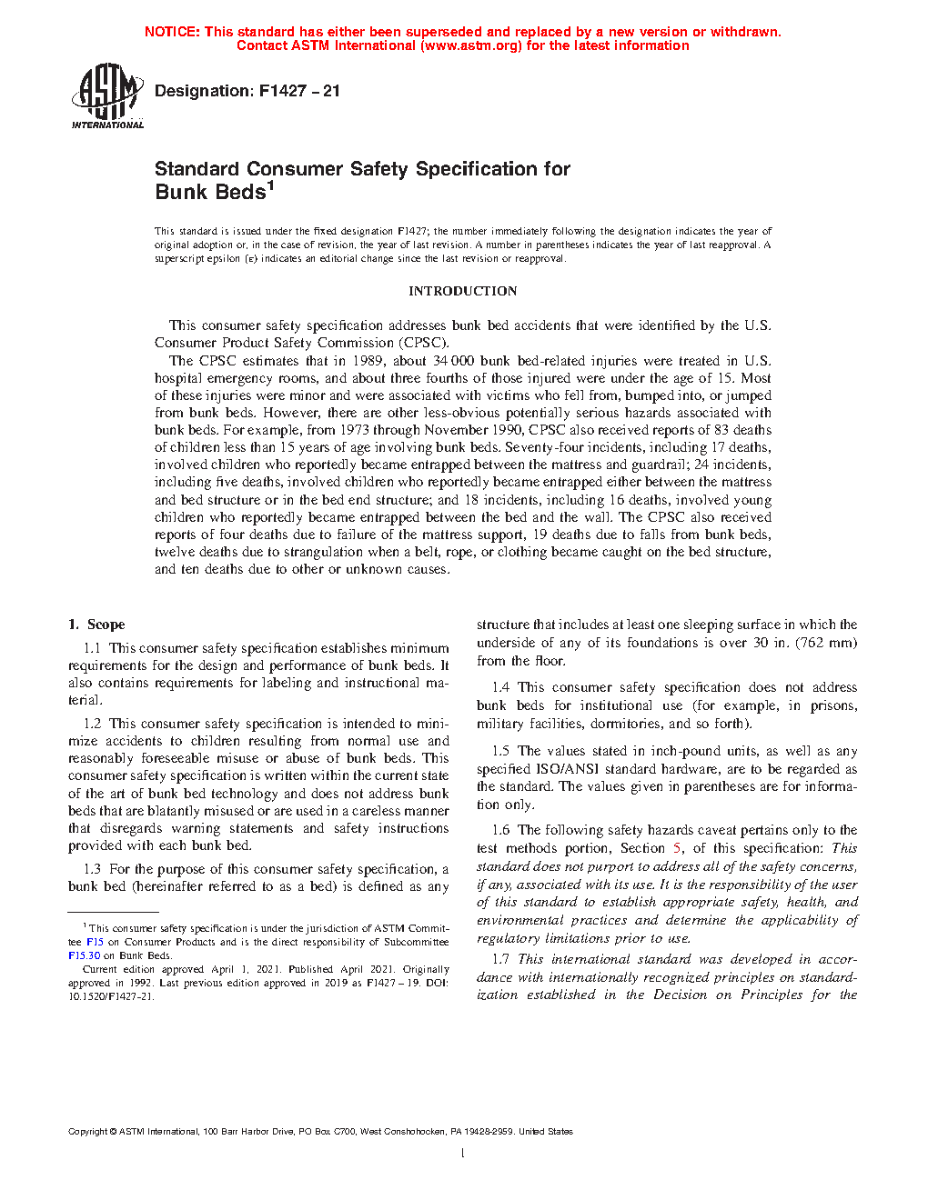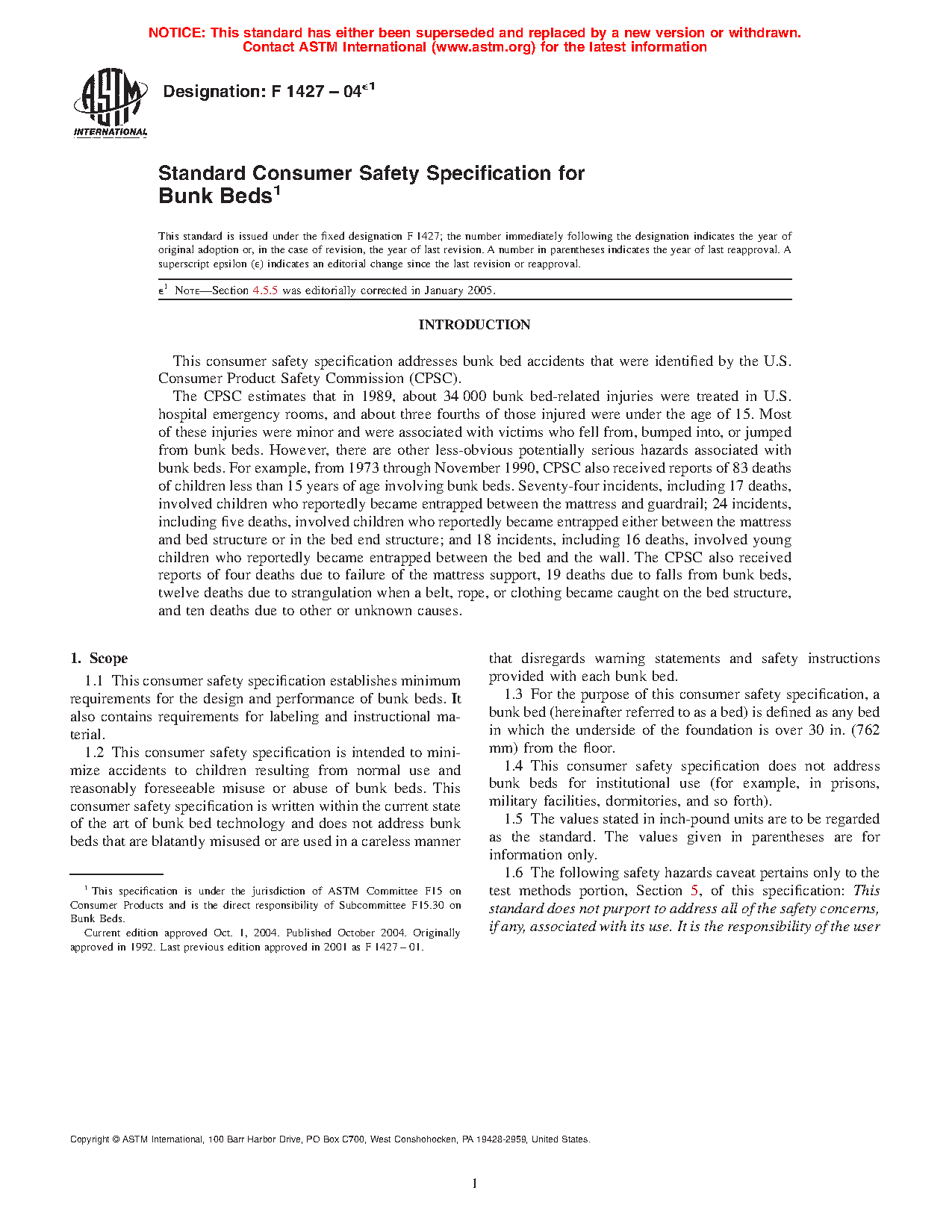 1.1 This consumer safety specification establishes minimum requirements for the design and performance of bunk beds. It also contains requirements for labeling and instructional material.