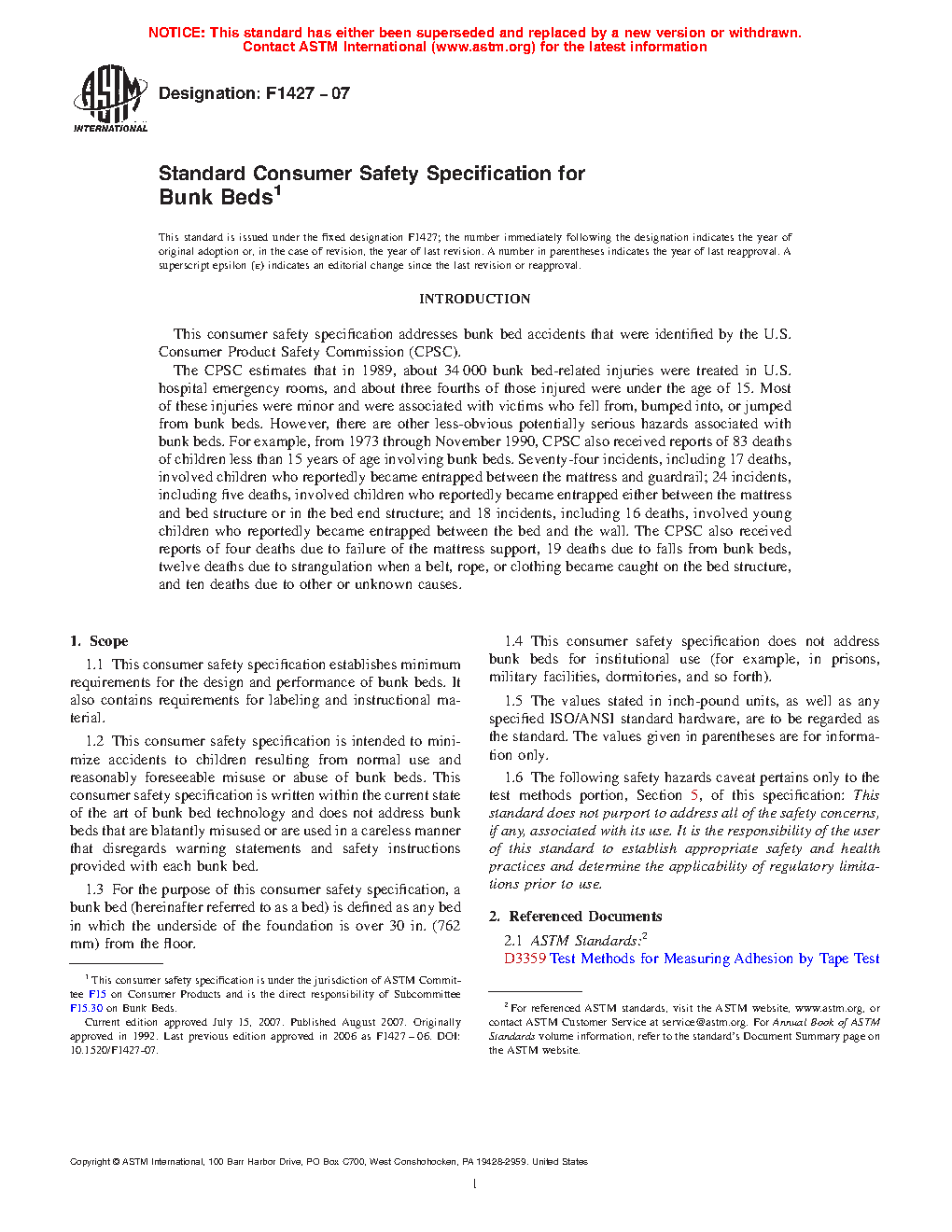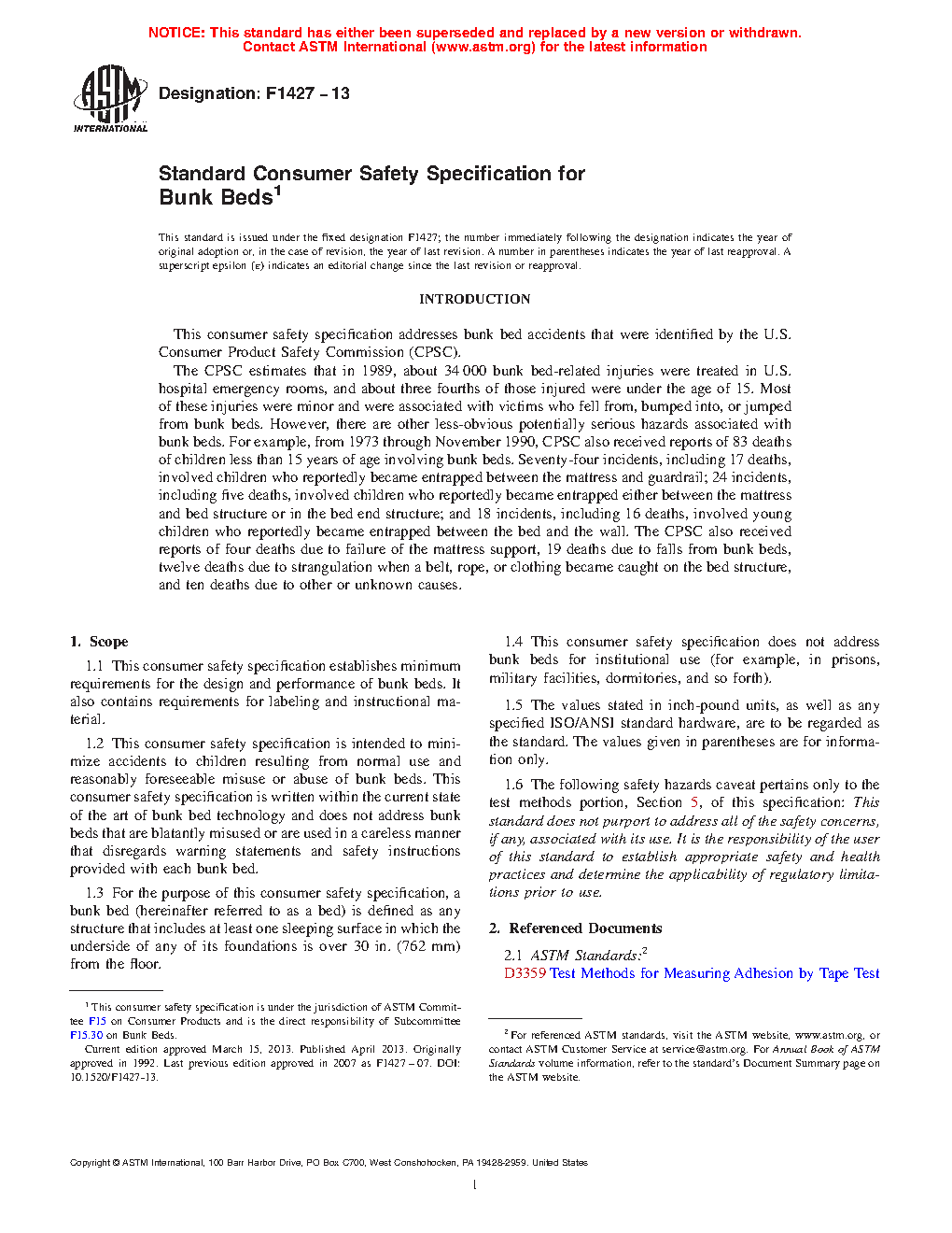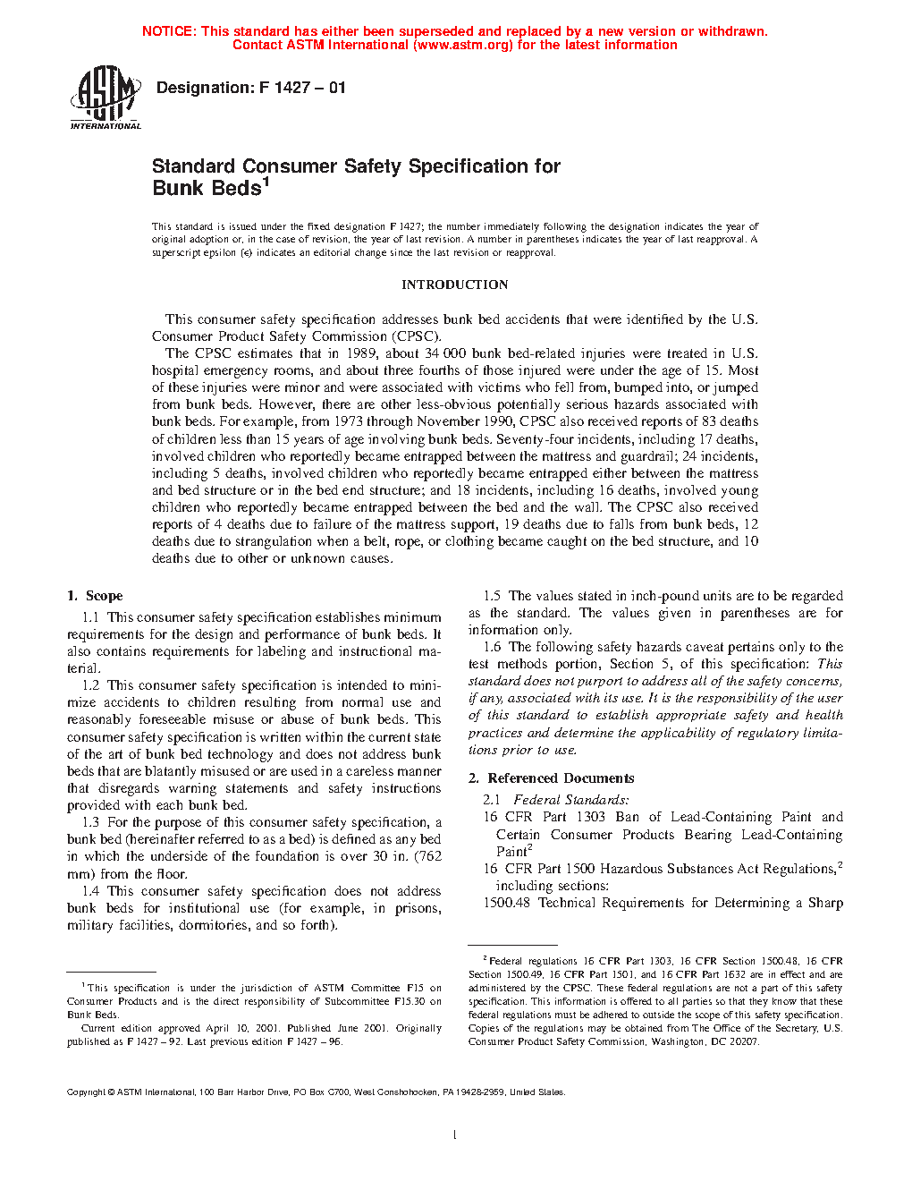 1.1 This consumer safety specification establishes minimum requirements for the design and performance of bunk beds. It also contains requirements for labeling and instructional material.