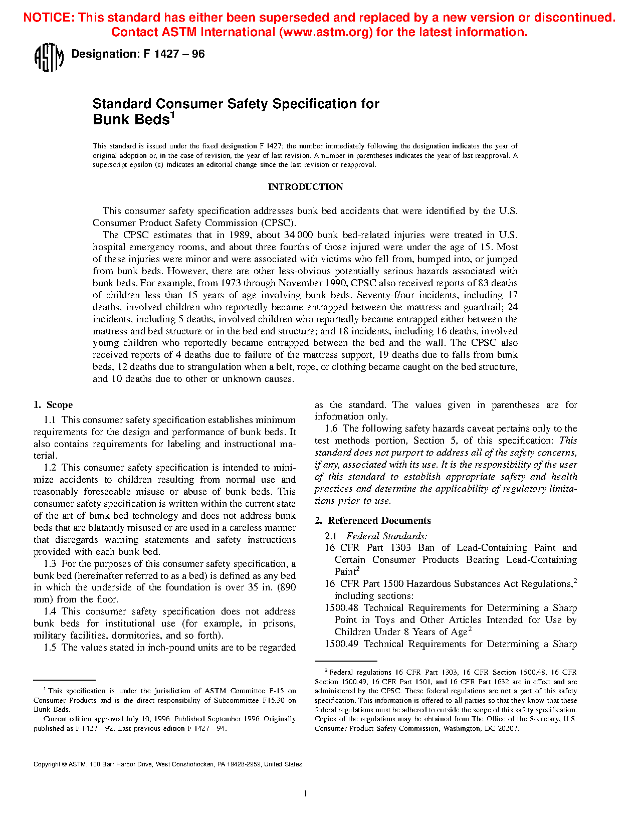 1.2 This consumer safety specification is intended to minimize accidents to children resulting from normal use and reasonably foreseeable misuse or abuse of bunk beds. This consumer safety specification is written within the current state of the art of bunk bed technology and does not address bunk beds that are blatantly misused or are used in a careless manner that disregards warning statements and safety instructions provided with each bunk bed.