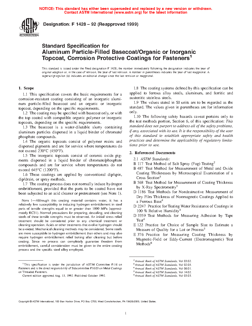 Note 1-Although this coating material contains water, it has a relatively low susceptibility to inducing hydrogen embrittlement in steel parts of tensile strengths equal to or greater than 1000 MPa (approximately RC31). Normal precautions for preparing, descaling, and cleaning steels of these tensile strengths must be observed. An initial stress relief treatment should be considered prior to any chemical treatment or cleaning operation. Acids or other treatments that evolve hydrogen should be avoided. Mechanical cleaning methods may be considered. Some steels are more susceptible to hydrogen embrittlement than others and may also require hydrogen embrittlement relief baking after cleaning but before coating. Since no process can completely guarantee freedom from embrittlement, careful consideration must be given to the entire coating process and the specific steel alloy employed.1.8 The coating systems defined by this specification can be applied to ferrous alloy steels, aluminum, and ferritic and austenitic stainless steels.