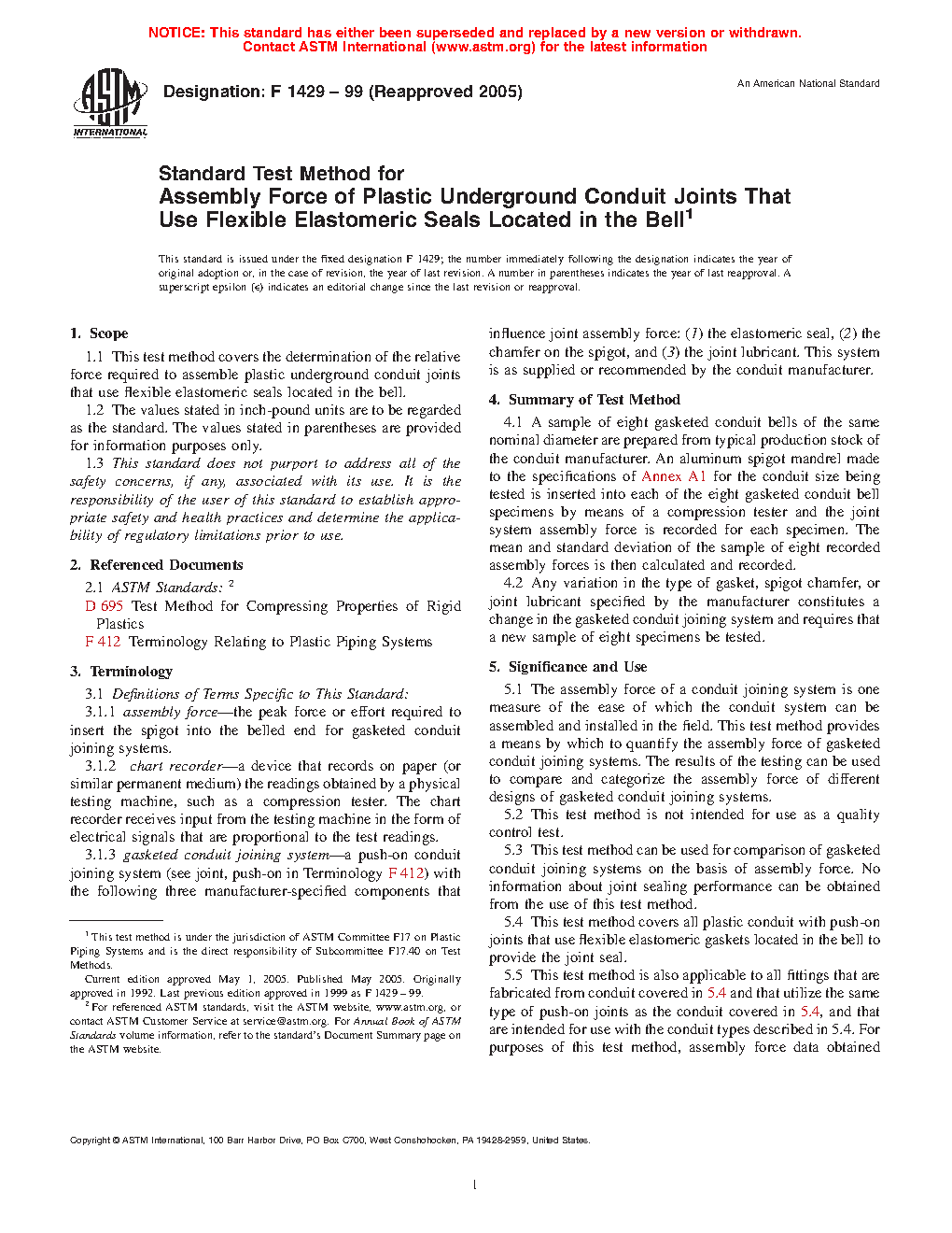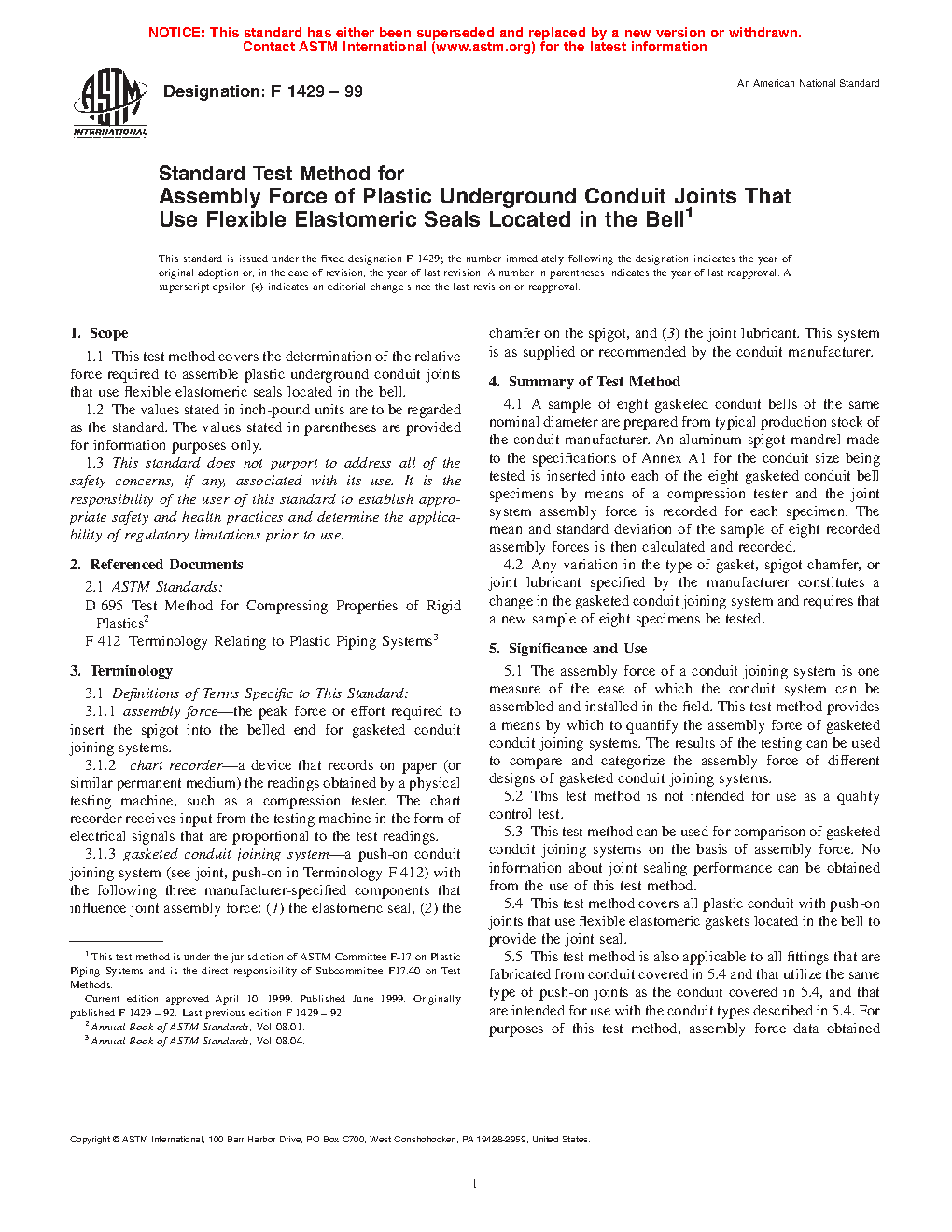 This test method can be used for comparison of gasketed conduit joining systems on the basis of assembly force. No information about joint sealing performance can be obtained from the use of this test method.