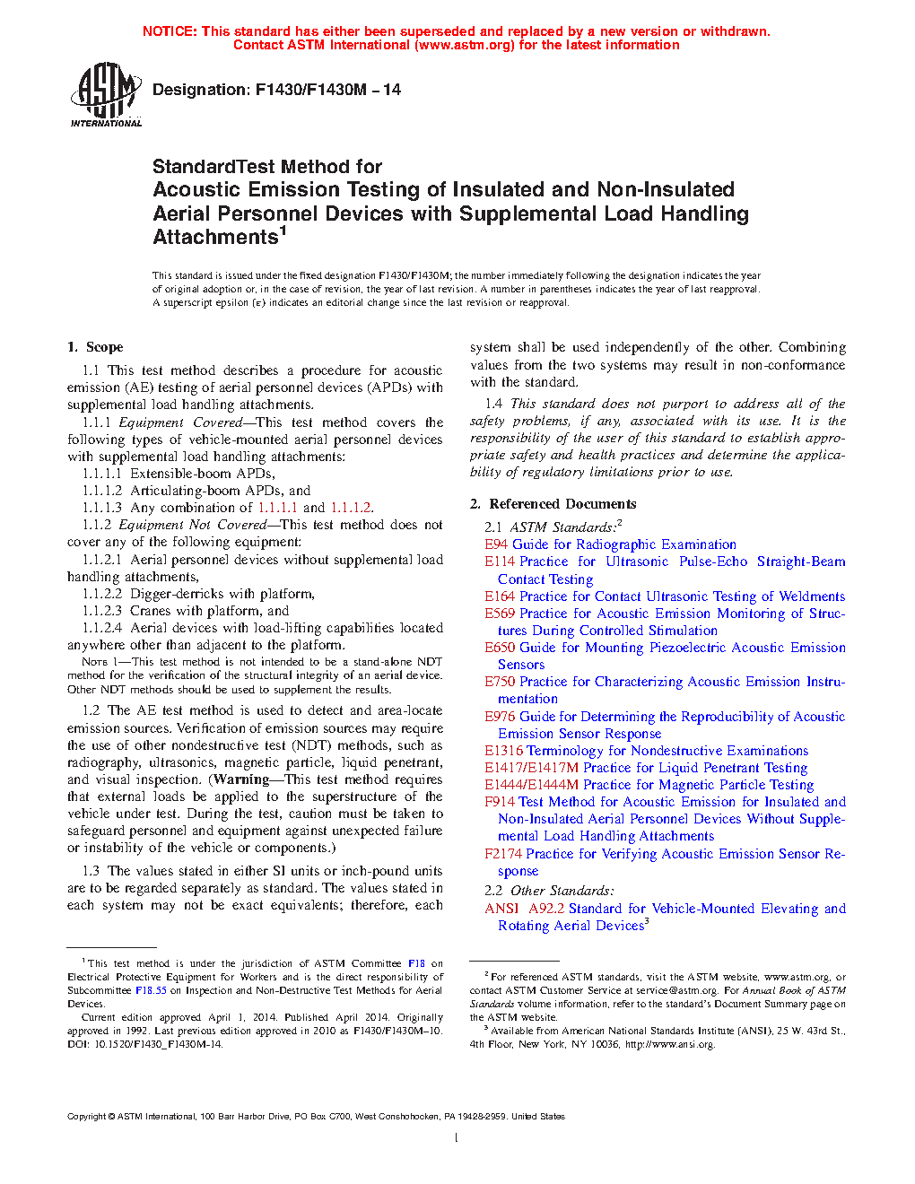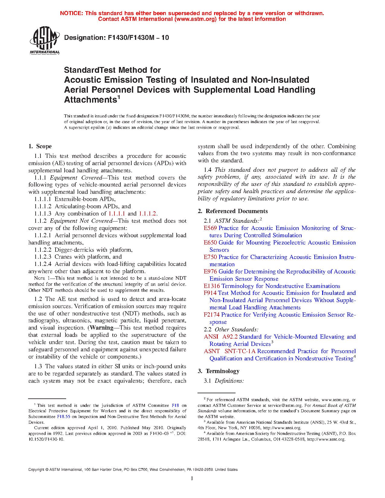 1.1 This test method describes a procedure for acoustic emission (AE) testing of aerial personnel devices (APDs) with supplemental load handling attachments.