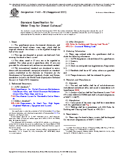 1.1 This specification covers the material, dimensions, and construction of diesel exhaust water traps, which shall be required whenever the exhaust is to be expelled through the hull of the vessel.