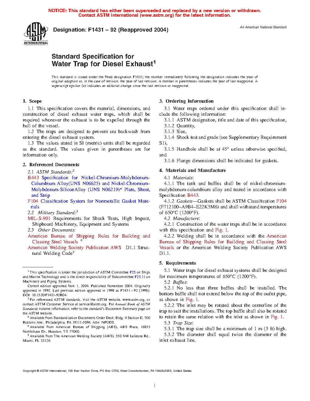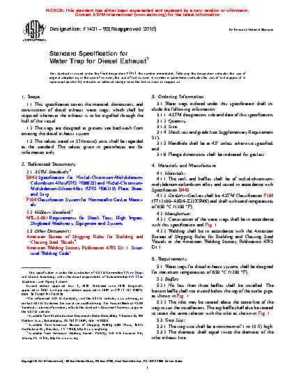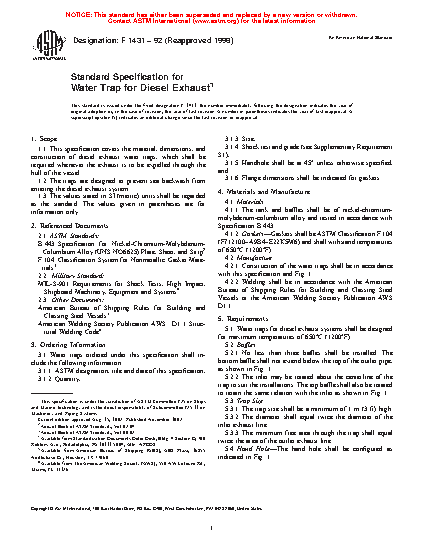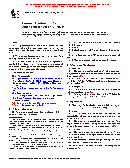 This specification covers the material, dimensions, and construction of a water trap for diesel exhaust. The diesel exhaust water trap system shall consist of a tank and baffles manufactured from a nickel-chromium-molybdenum-columbium alloy, with gaskets made of nonmetallic materials. A minimum of three baffles shall be installed. The traps shall withstand the maximum temperatures specified, be free of paint, and be so designed such as to prevent sea backwash from entering the diesel exhaust system. The trap and piping systems shall prevent dirt accumulation, with the welding being of small, even beading, free of slag and splatter. Pneumatic proof testing of each trap shall be performed with no visible seam leakage and shall conform to the requirements specified.