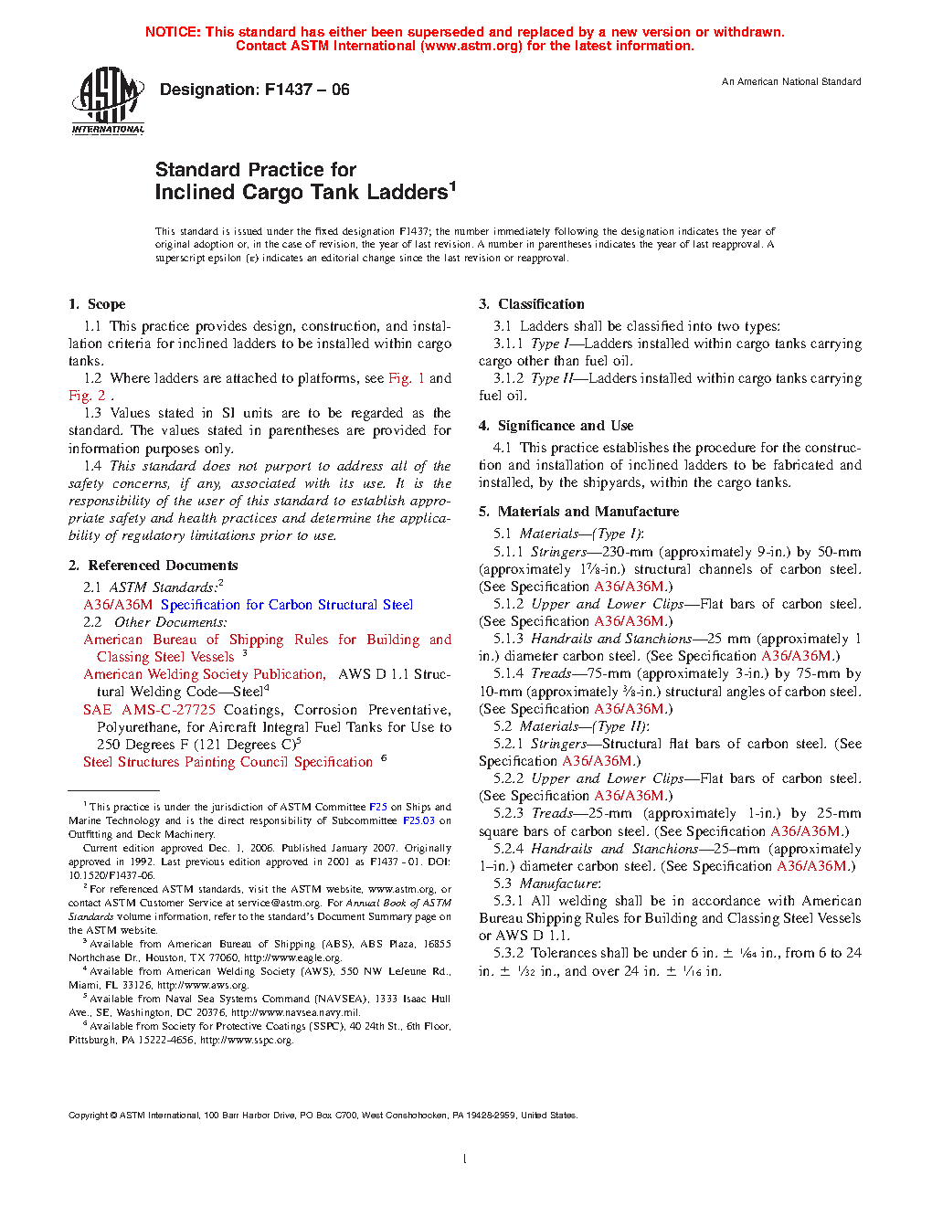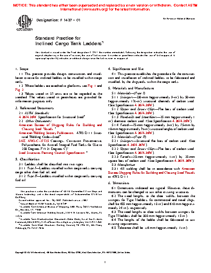 1.1 This practice provides design, construction, and installation criteria for inclined ladders to be installed within cargo tanks.