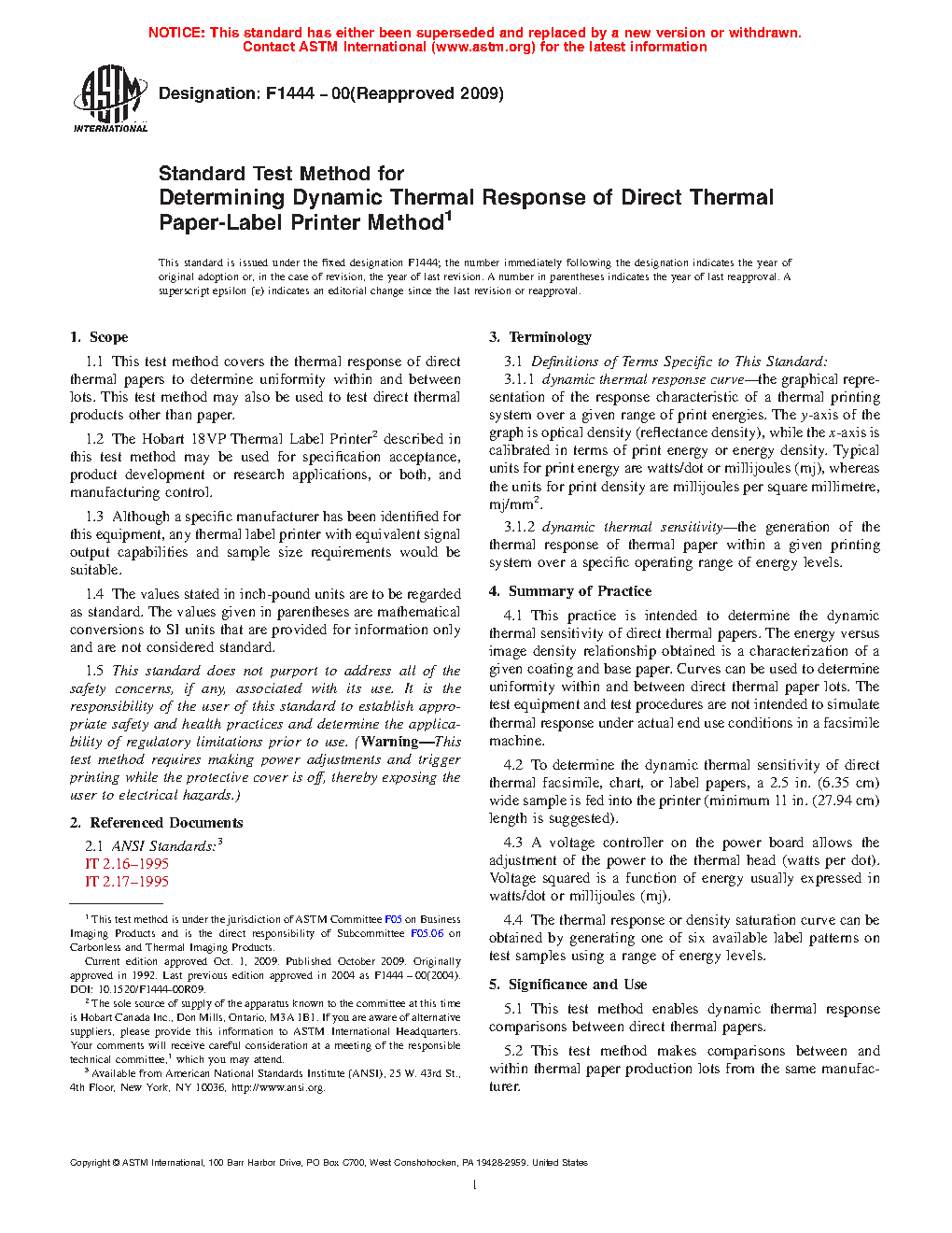 1.2 The Hobart 18VP Thermal Label Printer described in this test method may be used for specification acceptance, product development or research applications, or both, and manufacturing control.