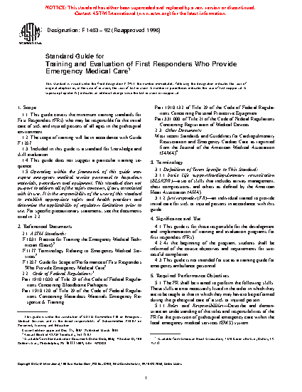 1.1 This guide covers the minimum training standards for First Responders (FRs) who may be responsible for the initial care of sick and injured persons of all ages in the prehospital environment.