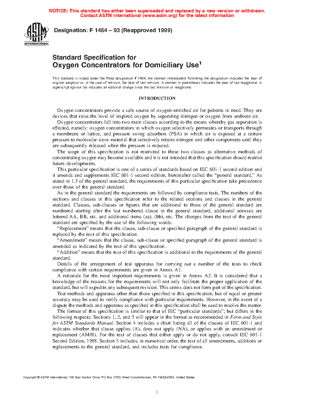 Standard Specification for Oxygen Concentrators for Domiciliary Use