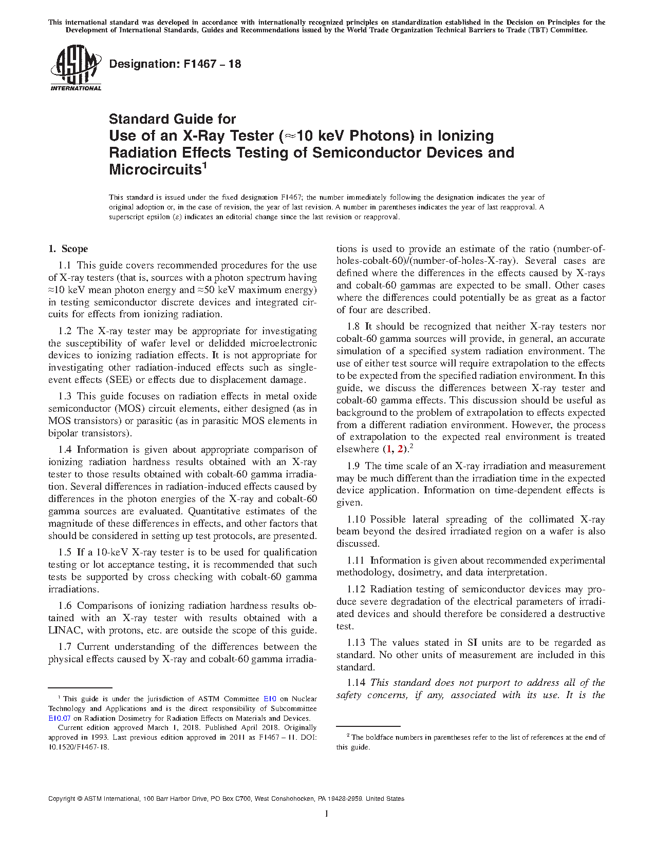 1.1 This guide covers recommended procedures for the use of X-ray testers (that is, sources with a photon spectrum having [approximate]10 keV mean photon energy and [approximate]50 keV maximum energy) in testing semiconductor discrete devices and integrated circuits for effects from ionizing radiation.