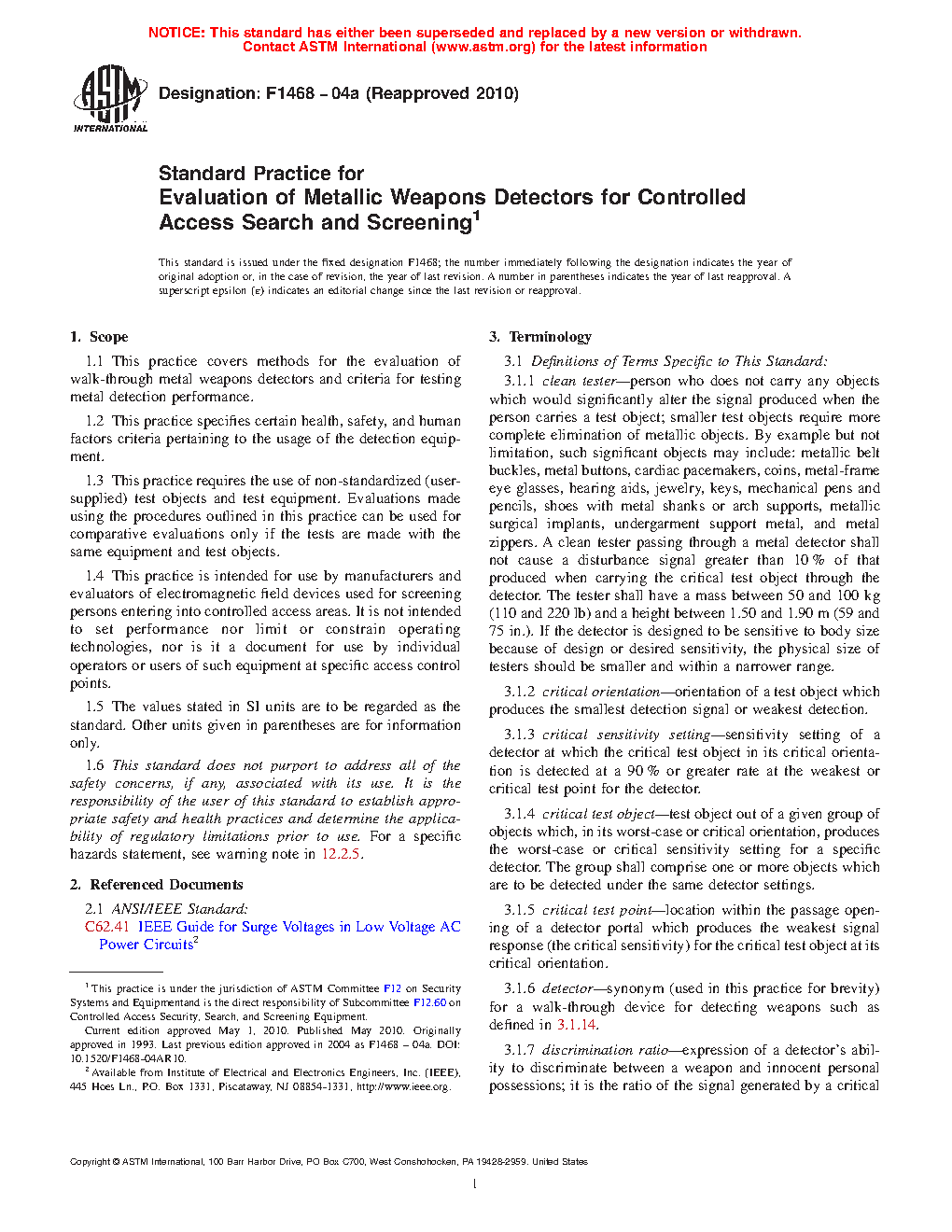1.1 This practice establishes standard methods for the evaluation of walk-through metal weapons detectors and criteria for testing metal detection performance.