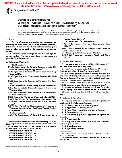 1.1 This specification covers the chemical, mechanical, and metallurgical requirements for wrought annealed titanium-6aluminum-4vanadium alloy (UNS R56400) to be used in the manufacture of surgical implants.