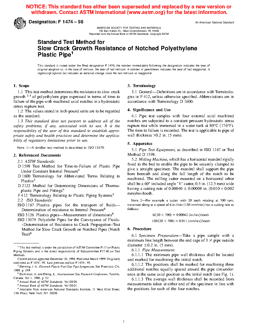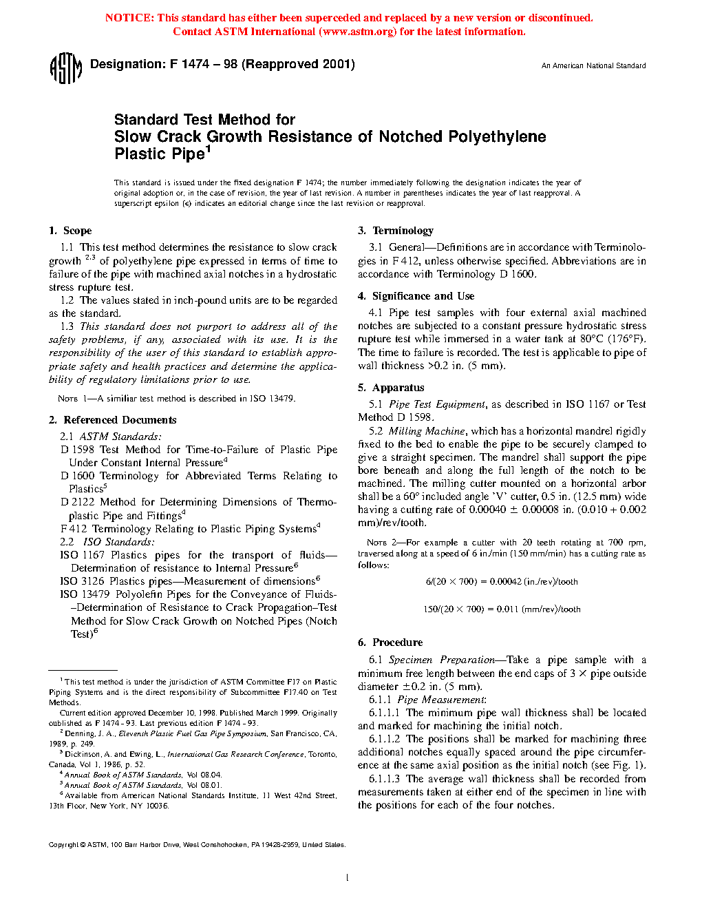 Standard Test Method for Slow Crack Growth Resistance of Notched Polyethylene Plastic Pipe (Withdrawn 2003)