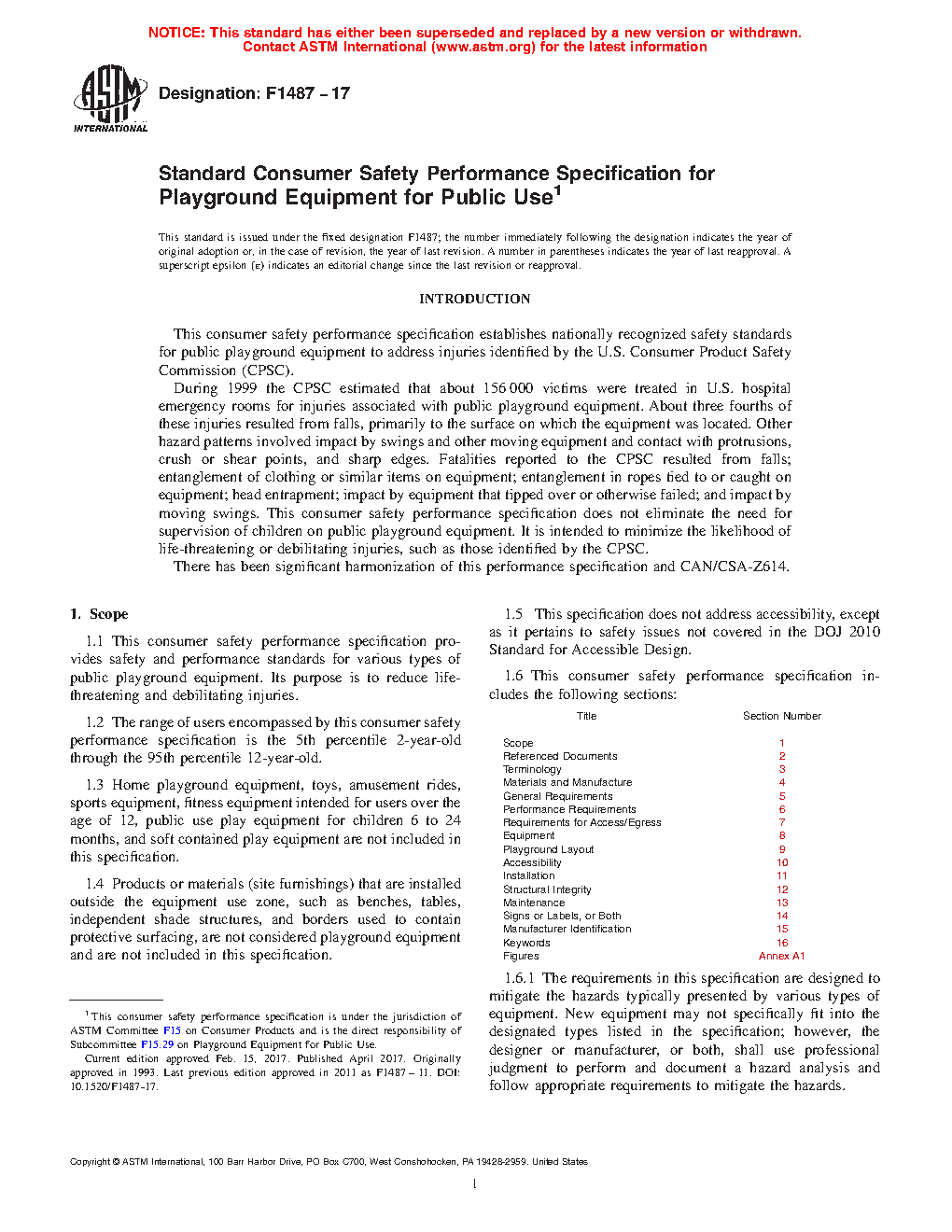 1.6 This consumer safety performance specification includes the following sections: