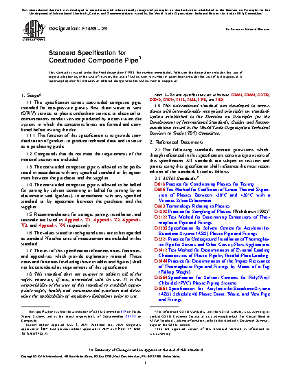 1.1 This specification covers coextruded composite pipe, intended for non-pressure gravity flow drain waste or vent (DWV) service, or plastic underdrain service, or electrical or comunications conduit service produced by a coextrusion die system, in which the concentric layers are formed and combined before exiting the die.