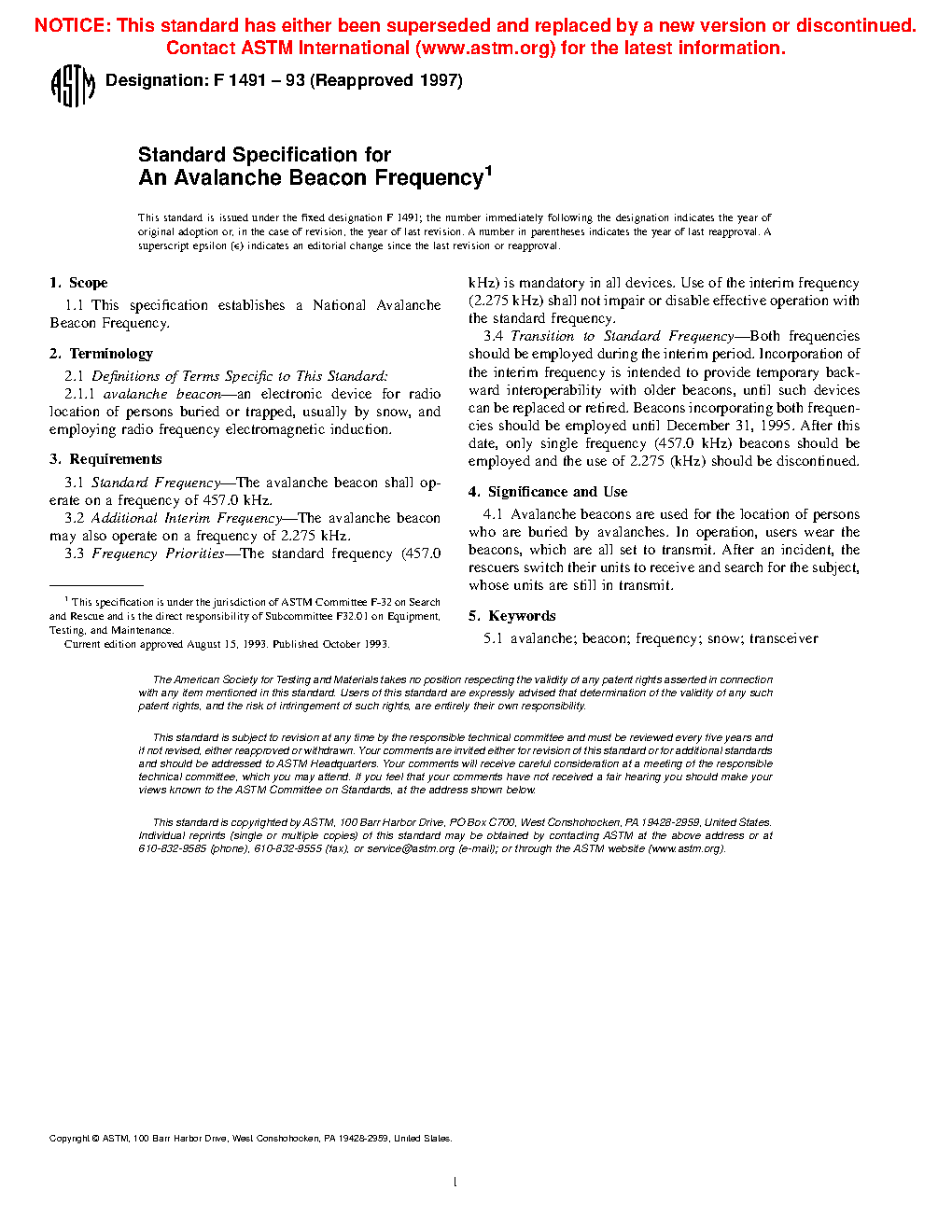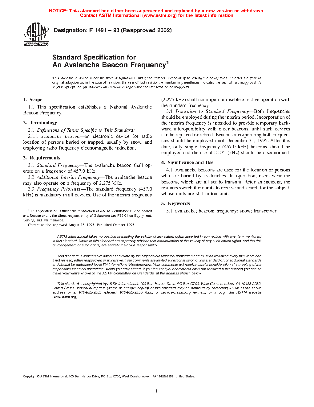 Standard Specification for An Avalanche Beacon Frequency (Withdrawn 2007)