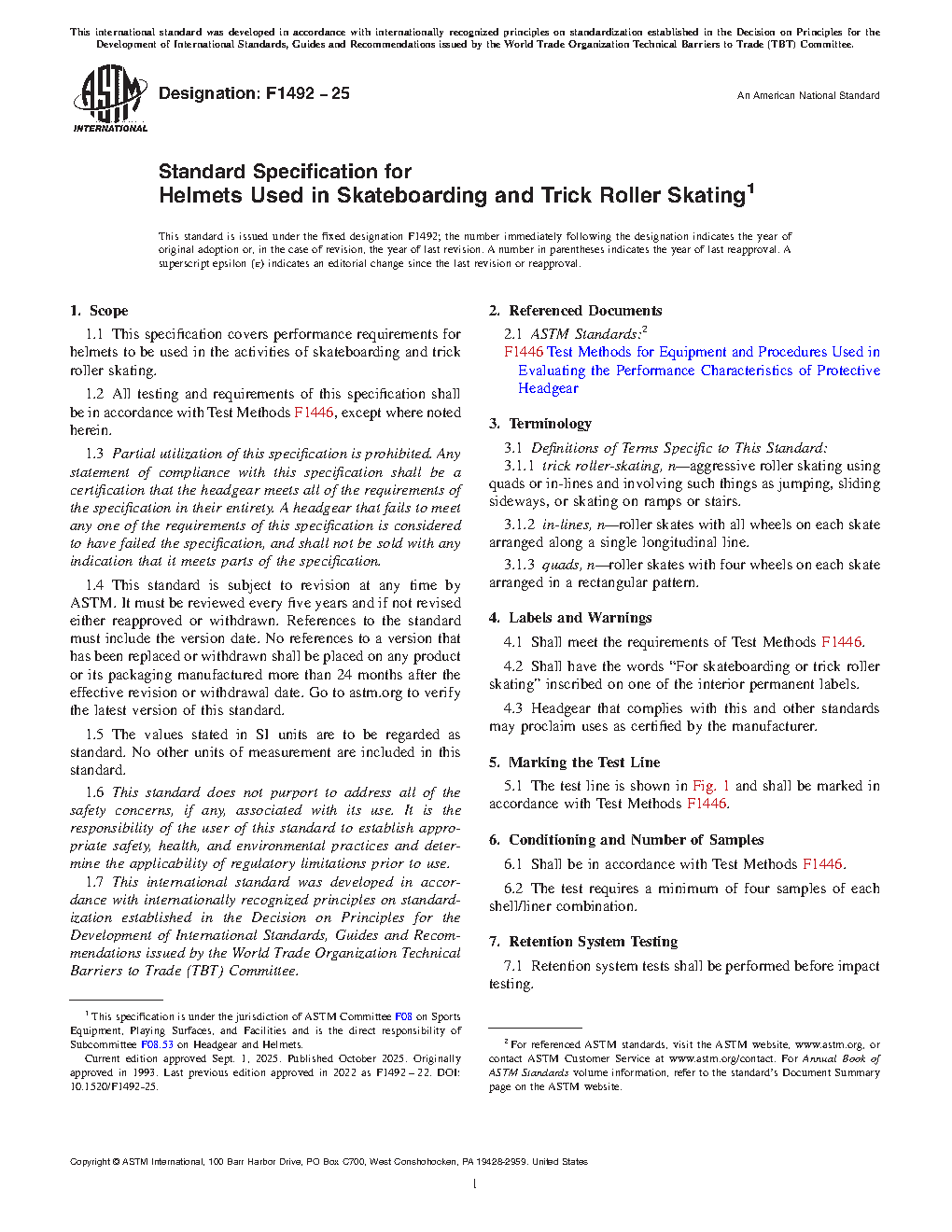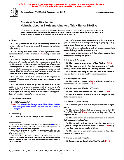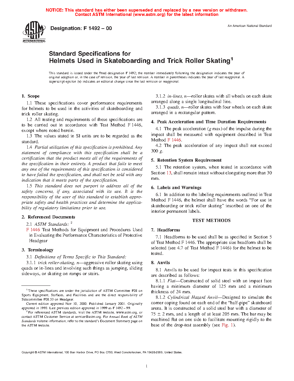 These specifications cover the design and performance requirements, and associated test procedures for helmets used in the activities of skateboarding and trick roller skating. When tested, the helmets shall meet specified requirements for the peak acceleration and time duration, headforms and sizes, anvils for impact (flat, cylindrical hazard, and triangular hazard anvils), dynamic strength retention system, and impact sites, velocity, and schedule.