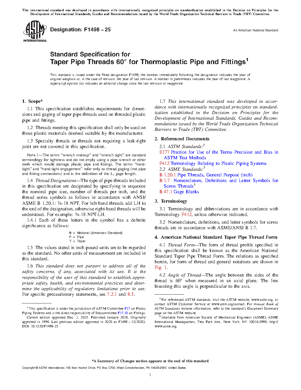 1.1 This specification establishes requirements for dimensions and gaging of taper pipe threads used on threaded plastic pipe and fittings.