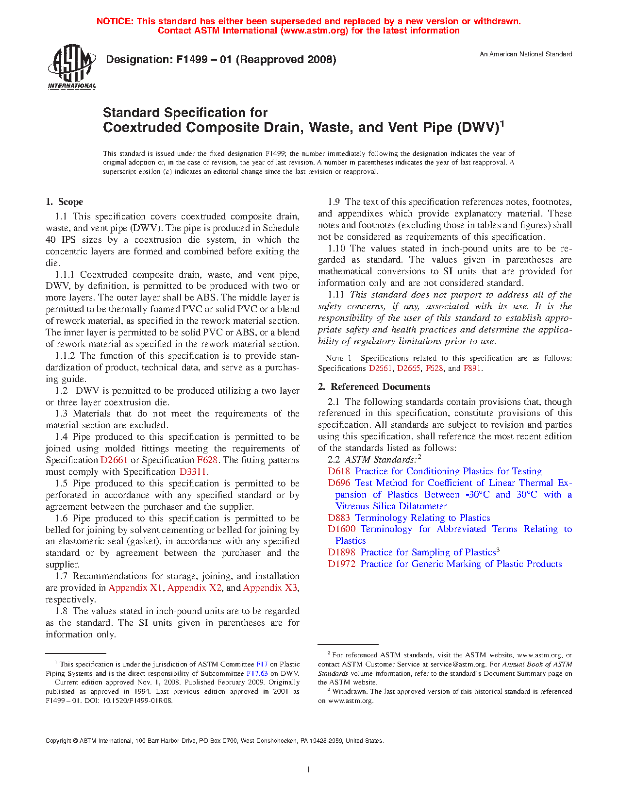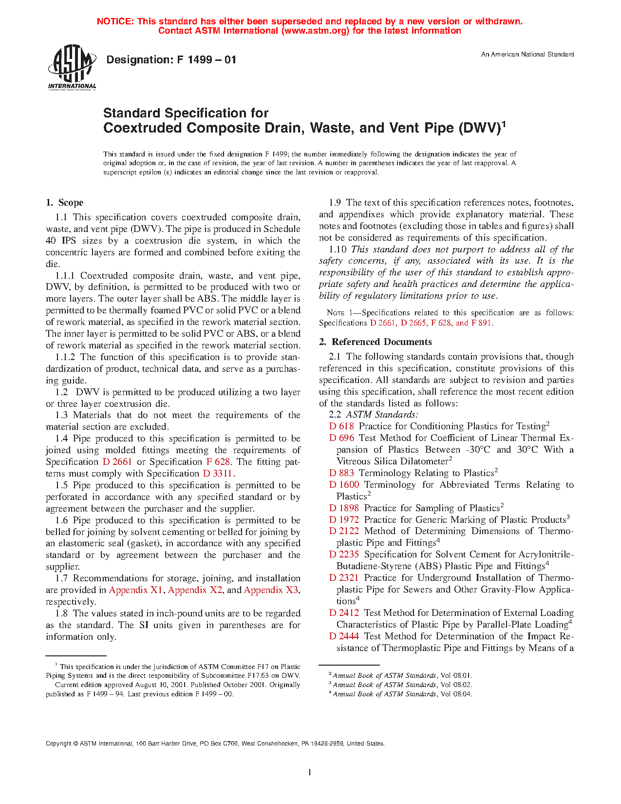 1.1 This specification covers coextruded composite drain, waste, and vent pipe (DWV). The pipe is produced in Schedule 40 IPS sizes by a coextrusion die system, in which the concentric layers are formed and combined before exiting the die.