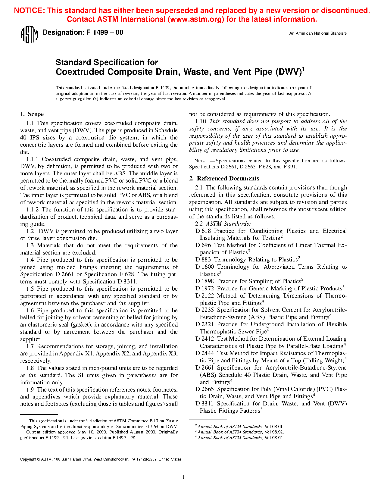 1.1.1 Coextruded composite drain, waste, and vent pipe, DWV, by definition, is permitted to be produced with two or more layers. The outer layer shall be ABS. The middle layer is permitted to be thermally foamed PVC or solid PVC or a blend of rework material, as specified in the rework material section. The inner layer is permitted to be solid PVC or ABS, or a blend of rework material as specified in the rework material section.