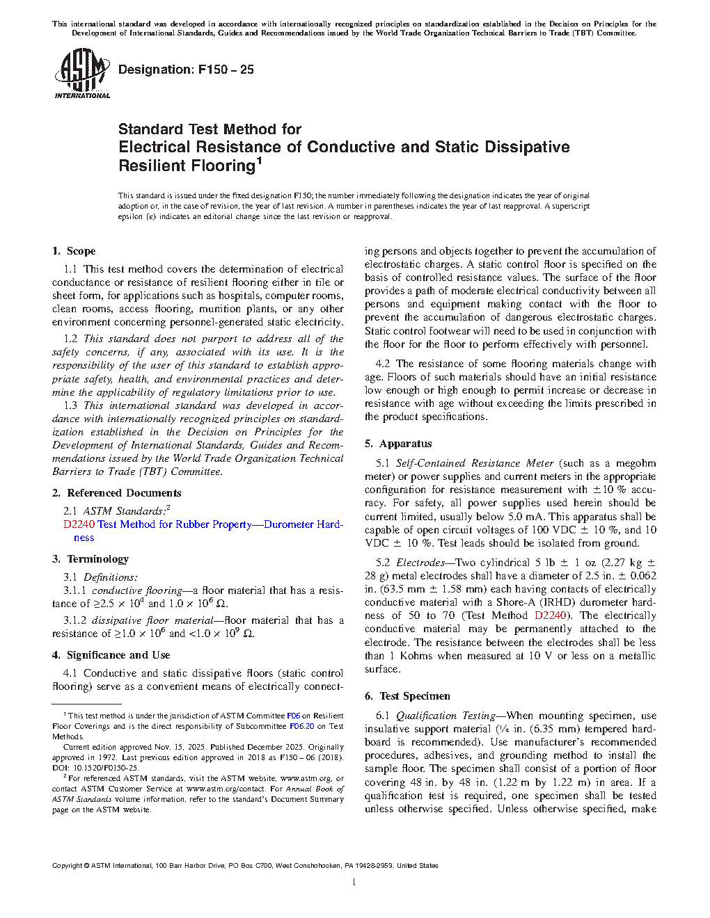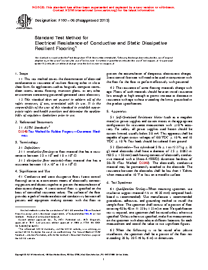 1.1 This test method covers the determination of electrical conductance or resistance of resilient flooring either in tile or sheet form, for applications such as hospitals, computer rooms, clean rooms, access flooring, munition plants, or any other environment concerning personnel-generated static electricity.