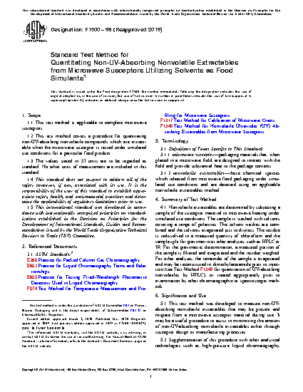 1.2 This test method covers a procedure for quantitating non-UV-absorbing nonvolatile compounds which are extractable when the microwave susceptor is tested under simulated use conditions for a particular food product.