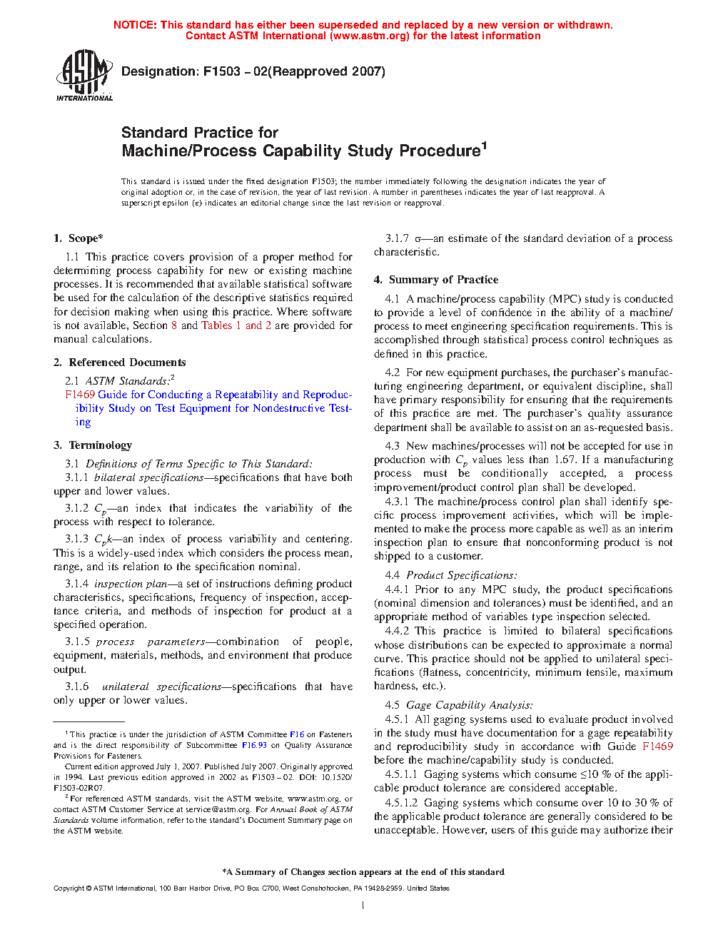 1.1 This practice covers provision of a proper method for determining process capability for new or existing machine processes. It is recommended that available statistical software be used for the calculation of the descriptive statistics required for decision making when using this practice. Where software is not available, Section 8 and Tables 1 and 2 are provided for manual calculations.