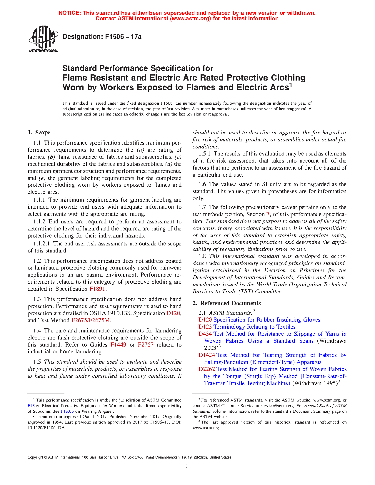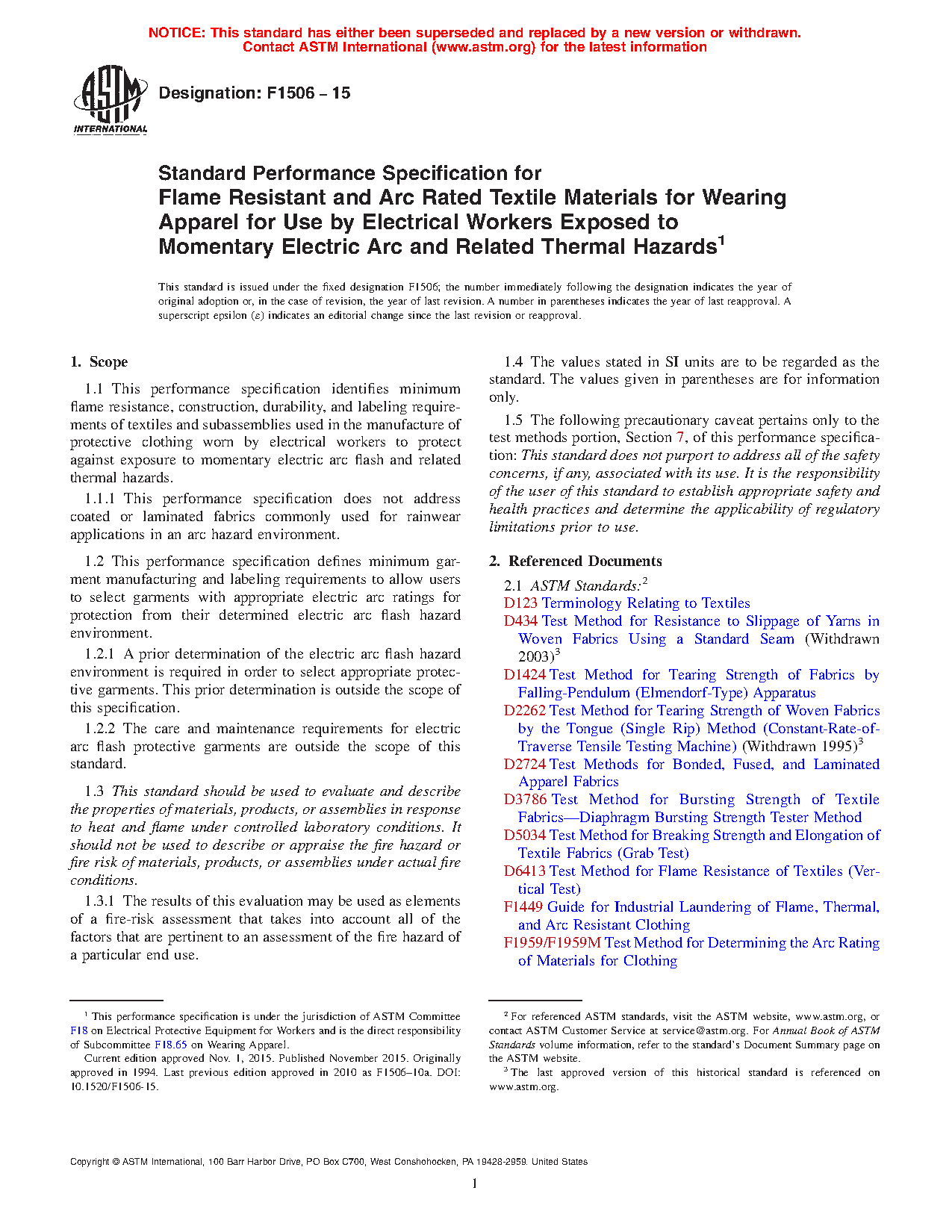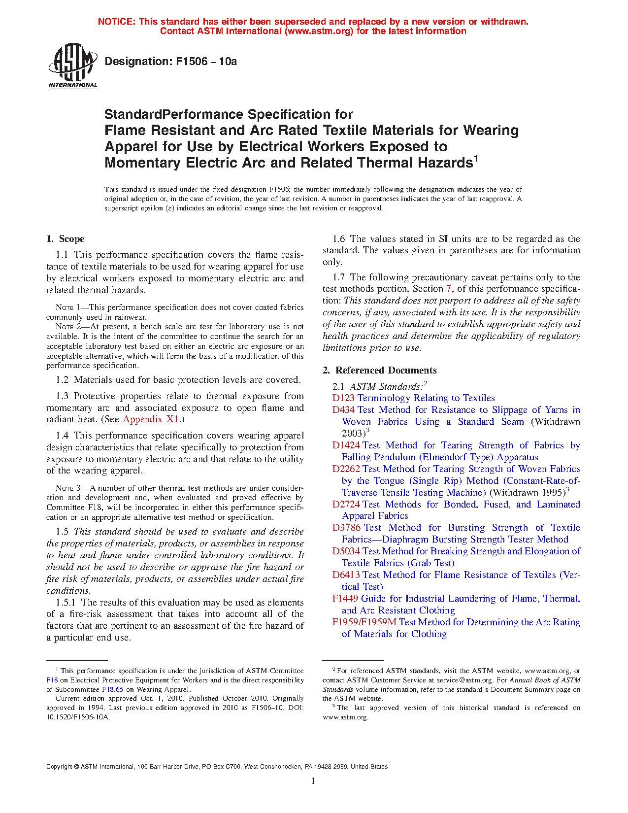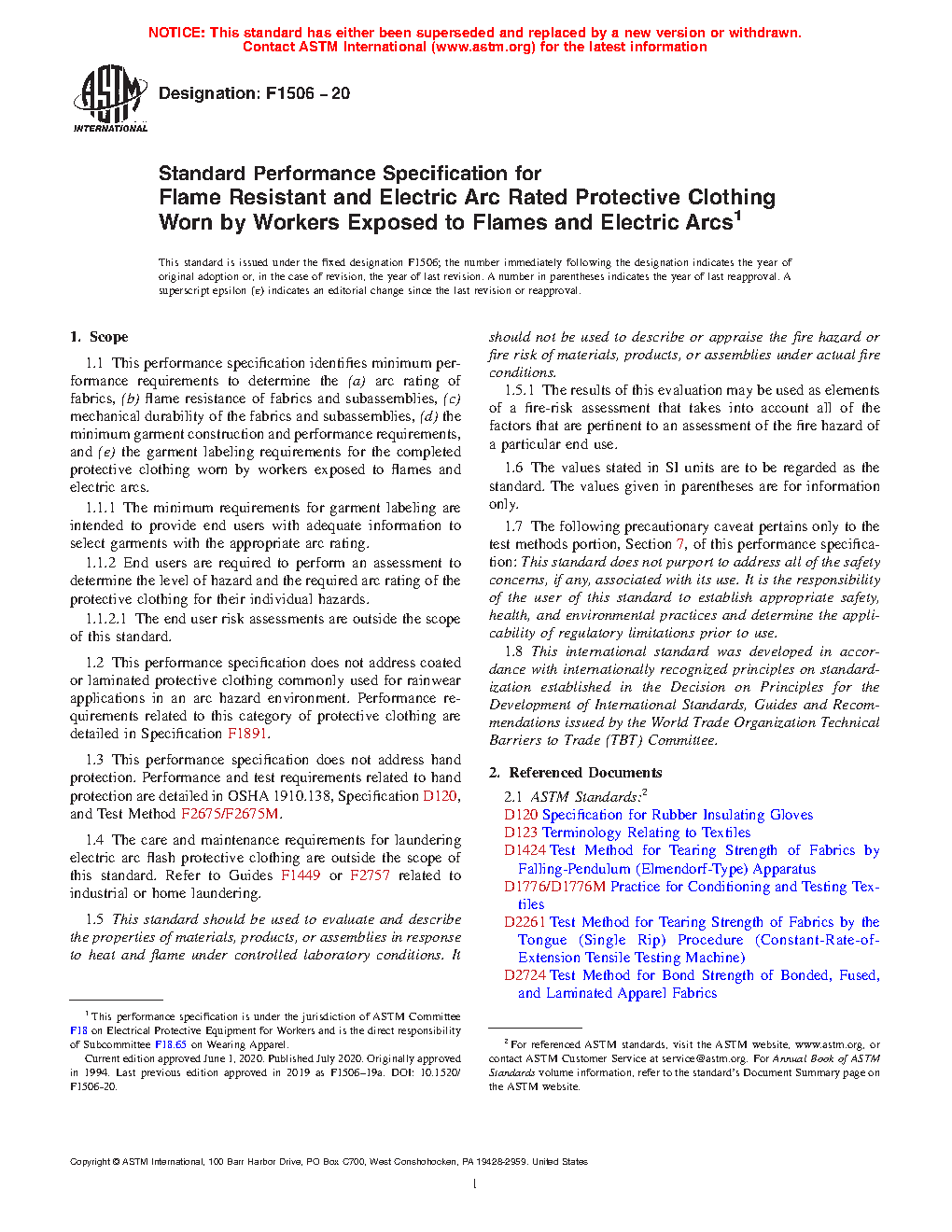 1.2 This performance specification does not address coated or laminated protective clothing commonly used for rainwear applications in an arc hazard environment. Performance requirements related to this category of protective clothing are detailed in Specification F1891.