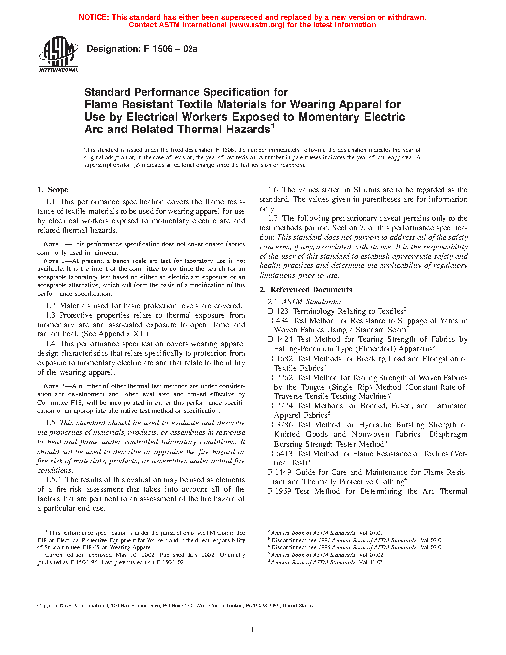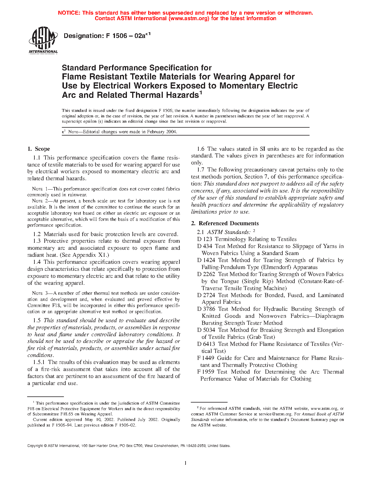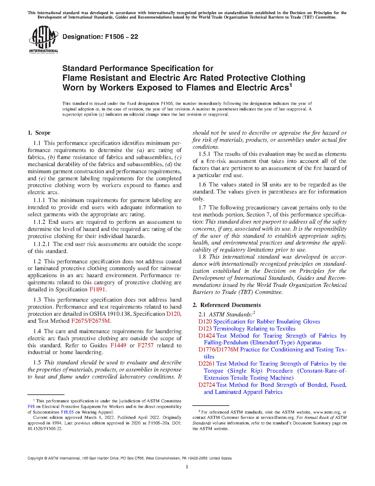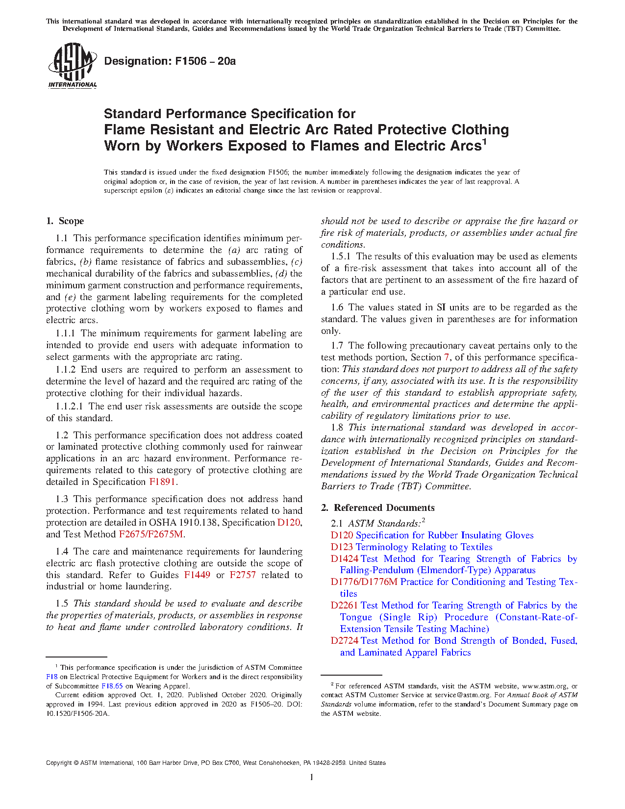 1.2 This performance specification does not address coated or laminated protective clothing commonly used for rainwear applications in an arc hazard environment. Performance requirements related to this category of protective clothing are detailed in Specification F1891.
