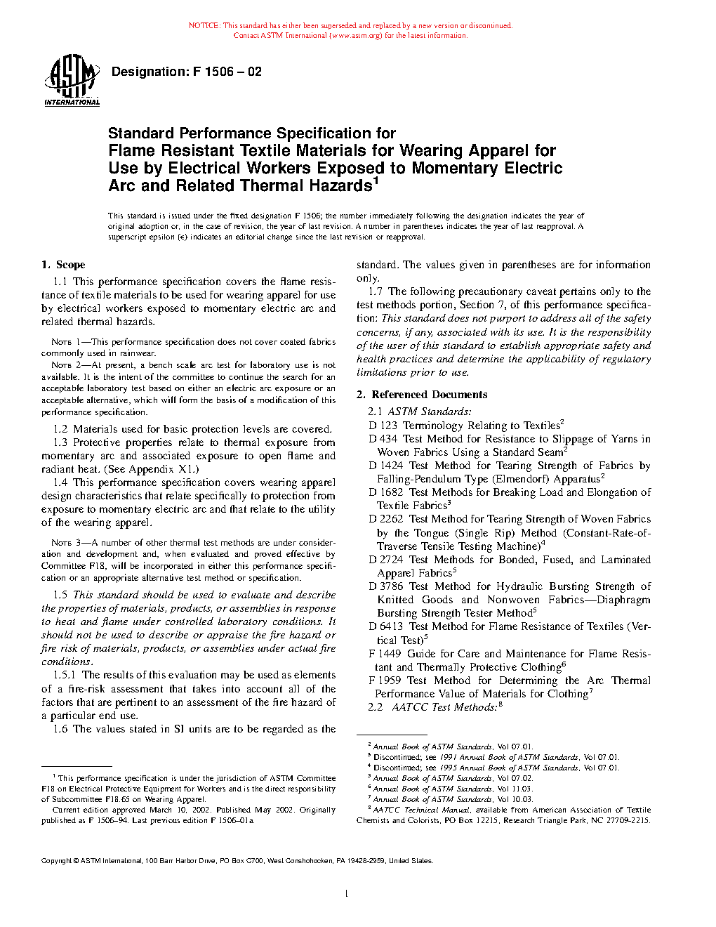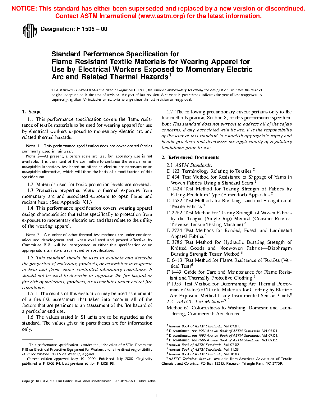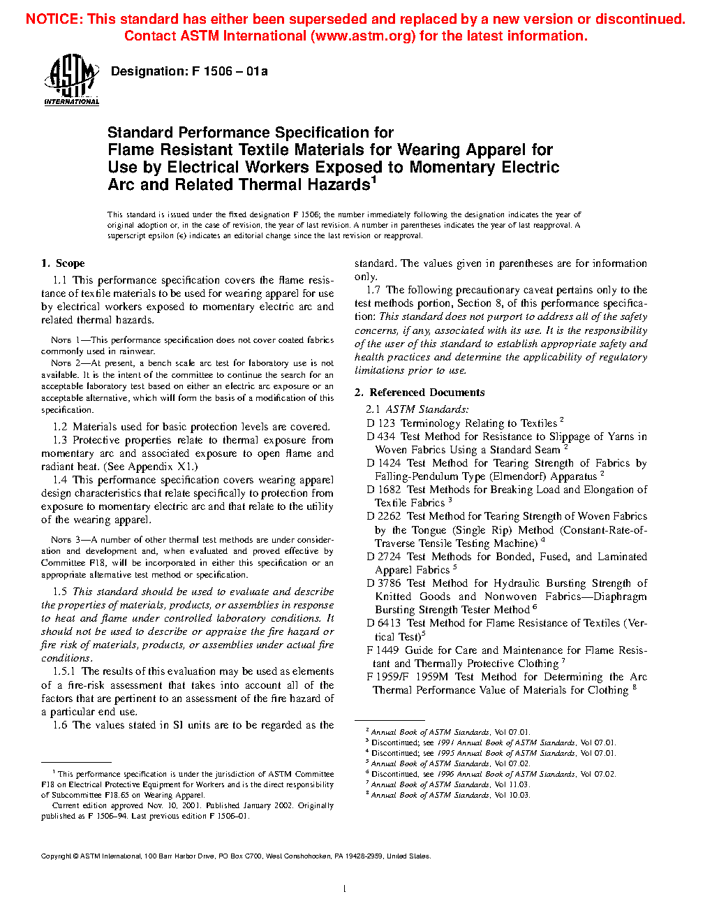 This performance specification covers the design characteristics and associated test methods that relate specifically to the flame resistance of textile materials used in the fabrication of basic protection level occupational apparel worn by electrical workers who are exposed to momentary electric arc and related thermal hazards such as exposure to open flame and radiant heat. When evaluated in accordance with the test procedures enlisted herein, knit fabrics and woven fabrics of different fabric weights shall conform to individually specified values of the following properties: colorfastness such as laundering shade change, dry-cleaning shade change, and dimensional change; initial flammability characteristics and flammability characteristics after 25 washes/dry-cleaning such as char length and afterflame time; and arc test rating. Knit fabrics shall additionally be tested and adhere accordingly to bursting strength characteristics. Conversely, woven fabrics shall also be tested and adhere accordingly to breaking load, tear resistance, and seam slippage characteristics.