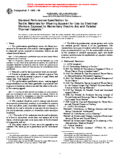1.2 This performance specification does not address coated or laminated protective clothing commonly used for rainwear applications in an arc hazard environment. Performance requirements related to this category of protective clothing are detailed in Specification F1891.