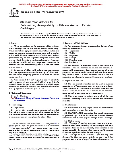1.1 These test methods are for evaluating ribbon welds in fabric cartridges that do not contain endless woven loops. These test methods apply to ribbon welds made with ultrasonic energy but do not cover special-purpose welds such as overlap or butt welds. Physical characteristics of ribbon welds and test performance may be used to predict acceptable function and printing life of the weld in the finished cartridge. These test methods are suitable both for comparative evaluations by end-users and for manufacturing control within the ribbon product industry.
