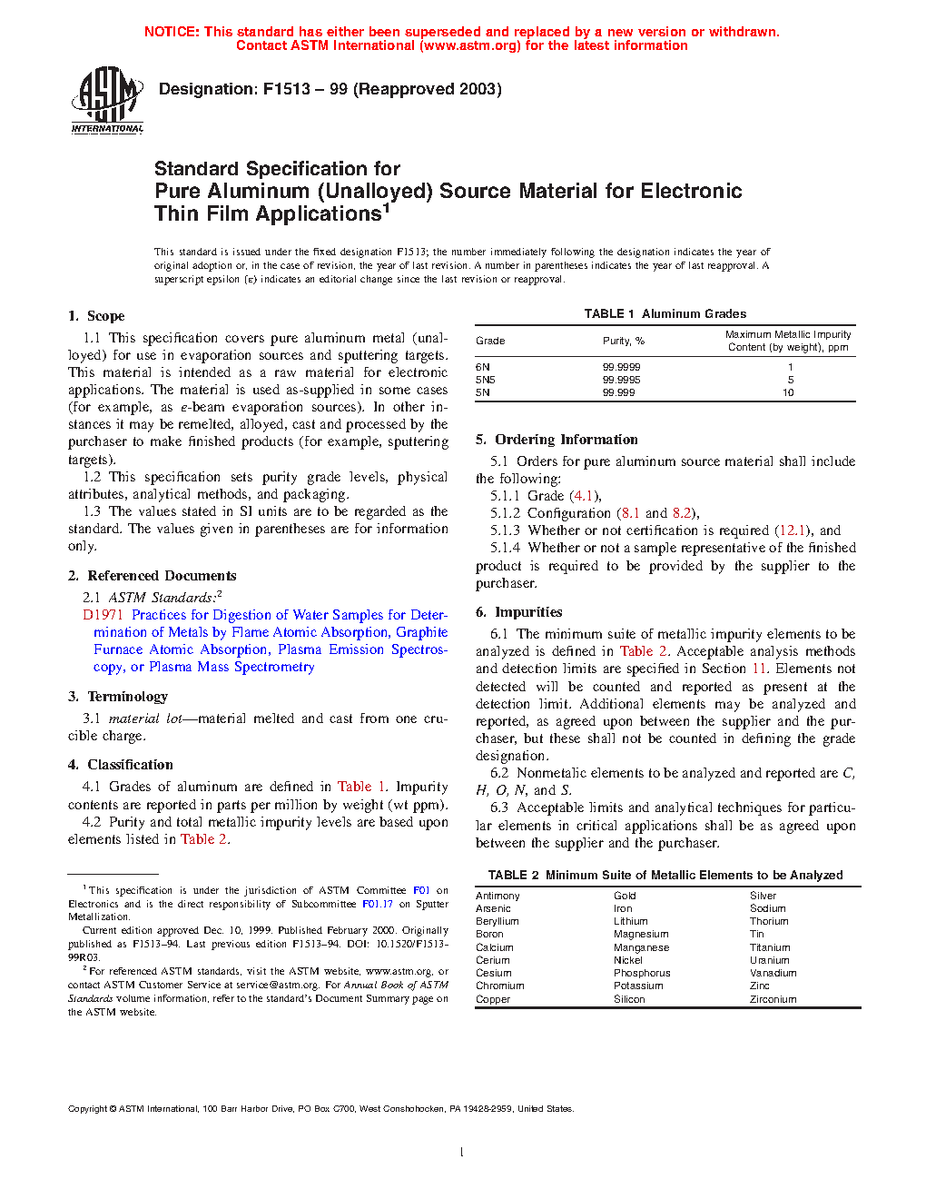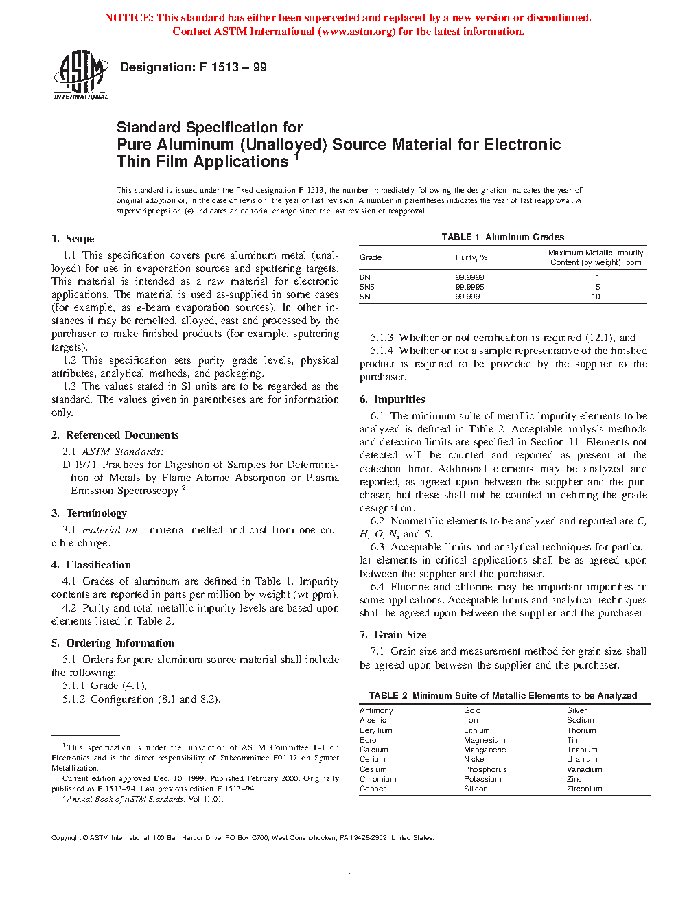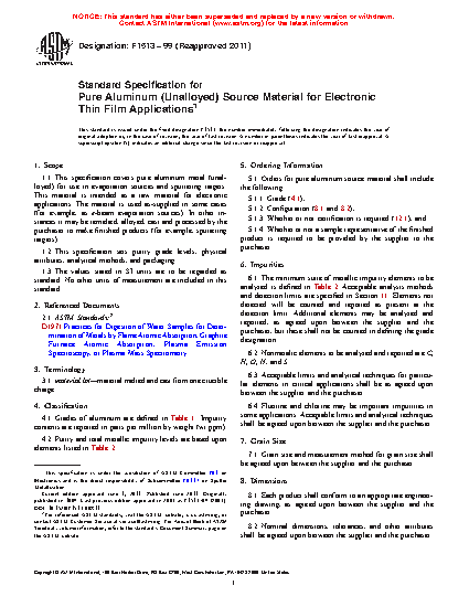 This specification sets purity grade levels, physical attributes, analytical methods, and packaging of three grades of pure unalloyed aluminum source materials for electronic thin film applications such as evaporation sources and sputtering targets. The impurity levels should be analyzed using the proposed method and should be within the specified range for each grade.