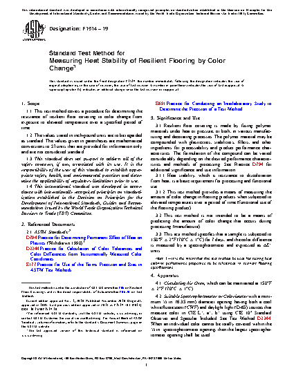 1.1 This test method covers a procedure for determining the resistance of resilient floor covering to color change from exposure to elevated temperature over a specified period of time.
