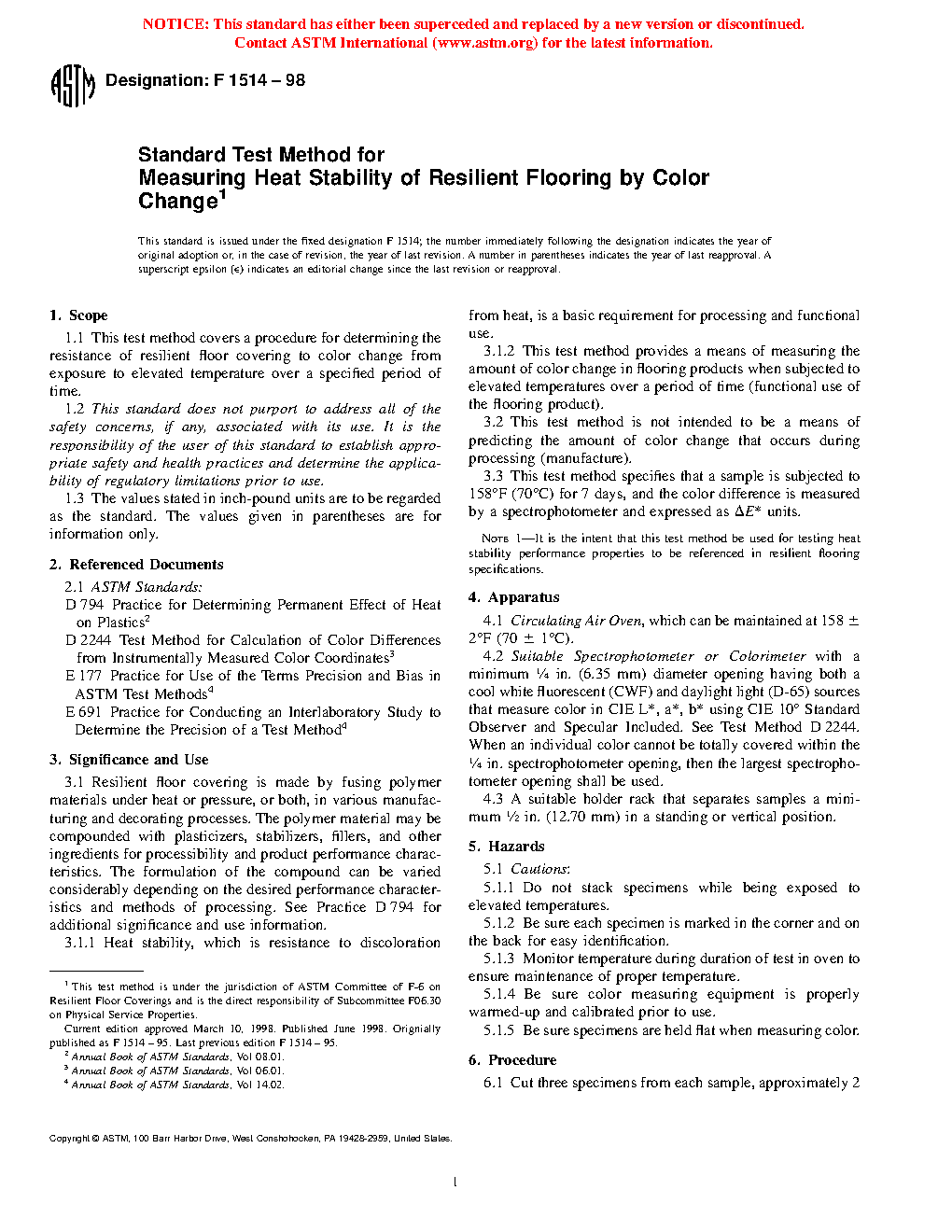 3.1.2 This test method provides a means of measuring the amount of color change in flooring products when subjected to elevated temperatures over a period of time (functional use of the flooring product).