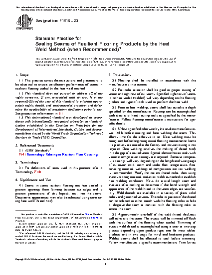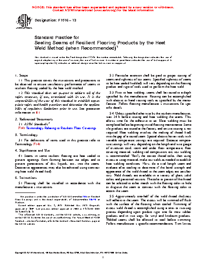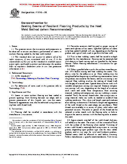 1.1 This practice covers the instructions and precautions to be observed to ensure satisfactory performance of seams in resilient flooring sealed by the heat weld method.