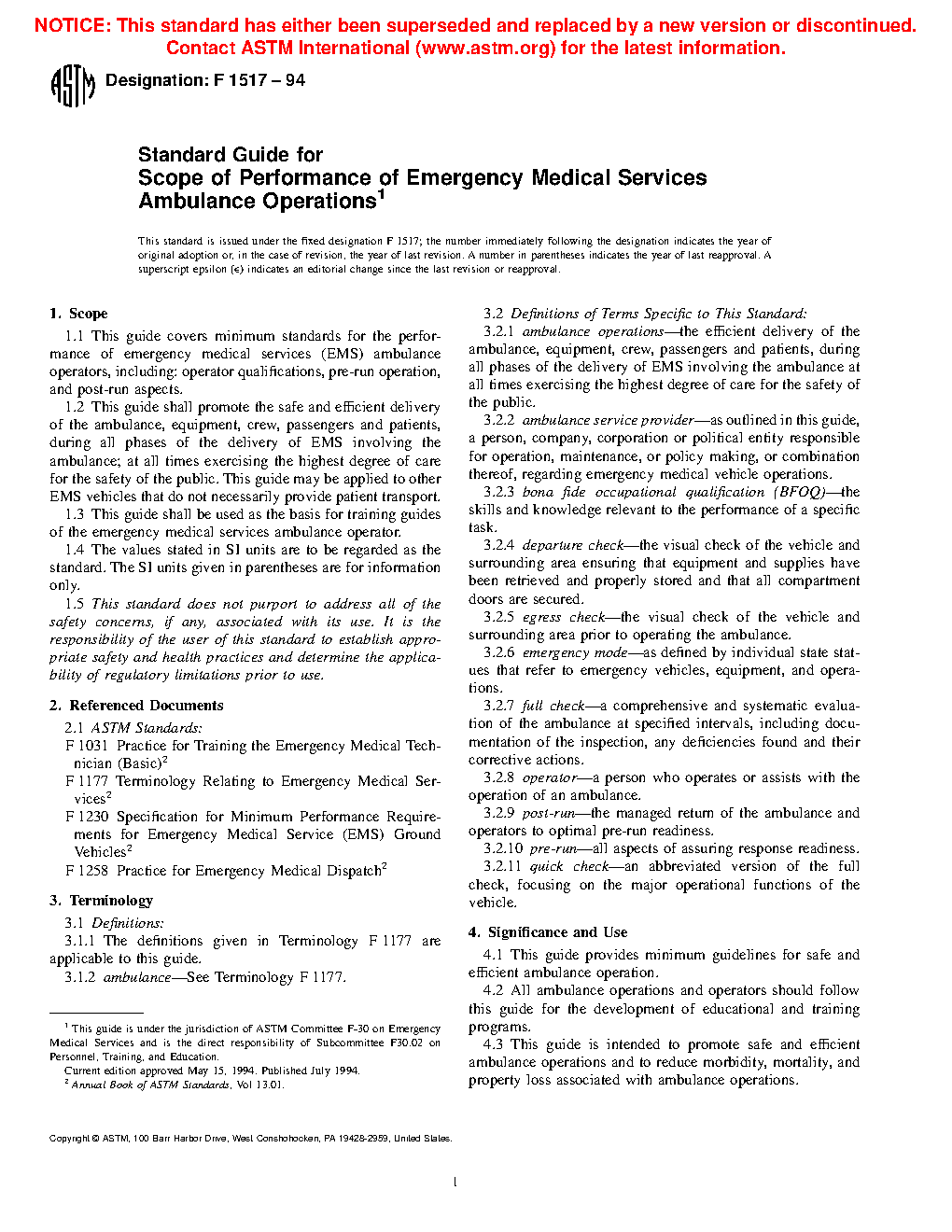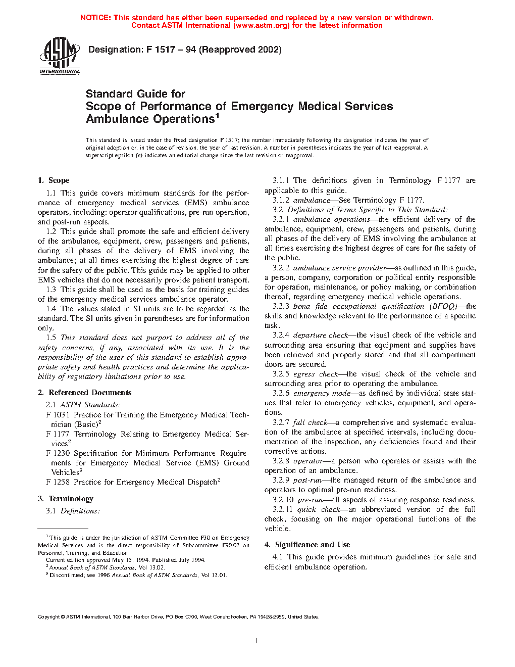 1.1 This guide covers minimum standards for the performance of emergency medical services (EMS) ambulance operators, including: operator qualifications, pre-run operation, and post-run aspects.