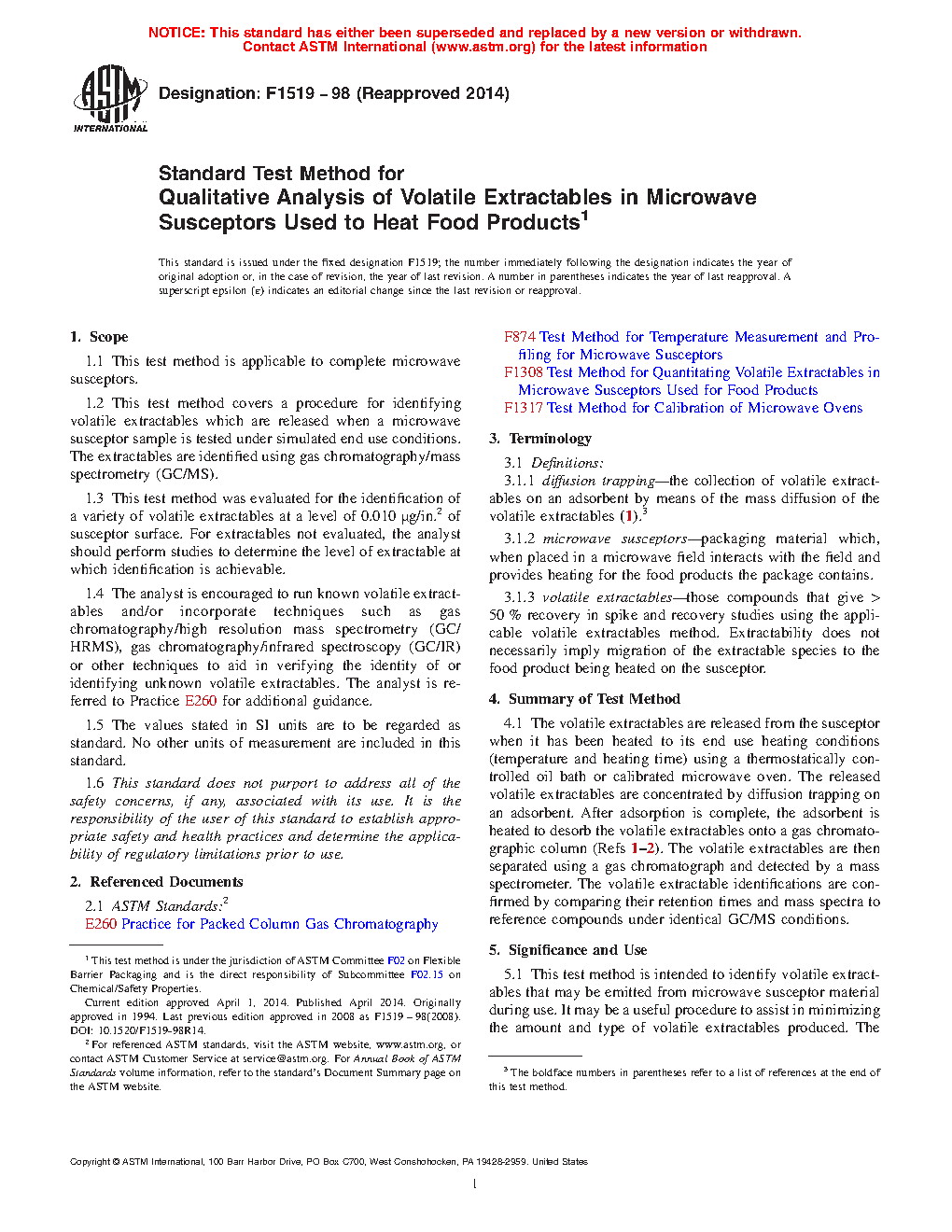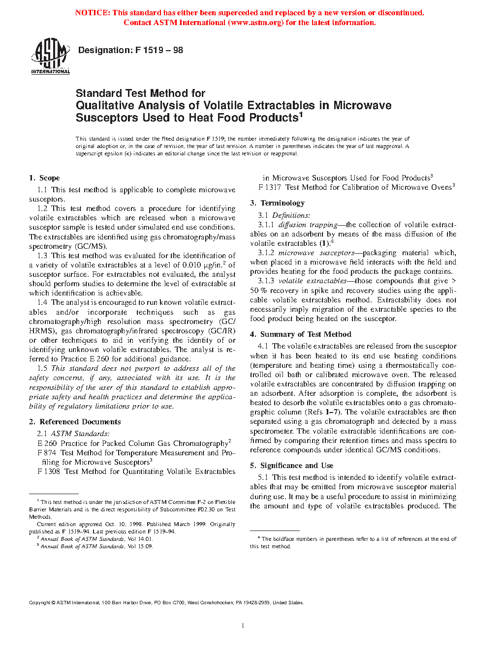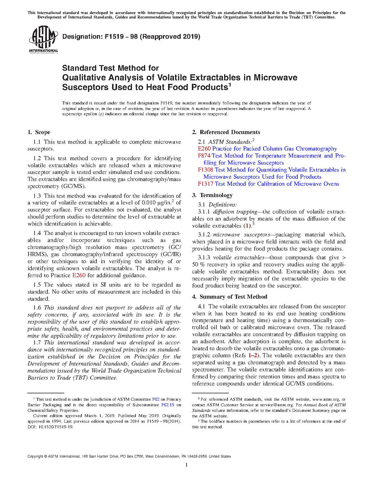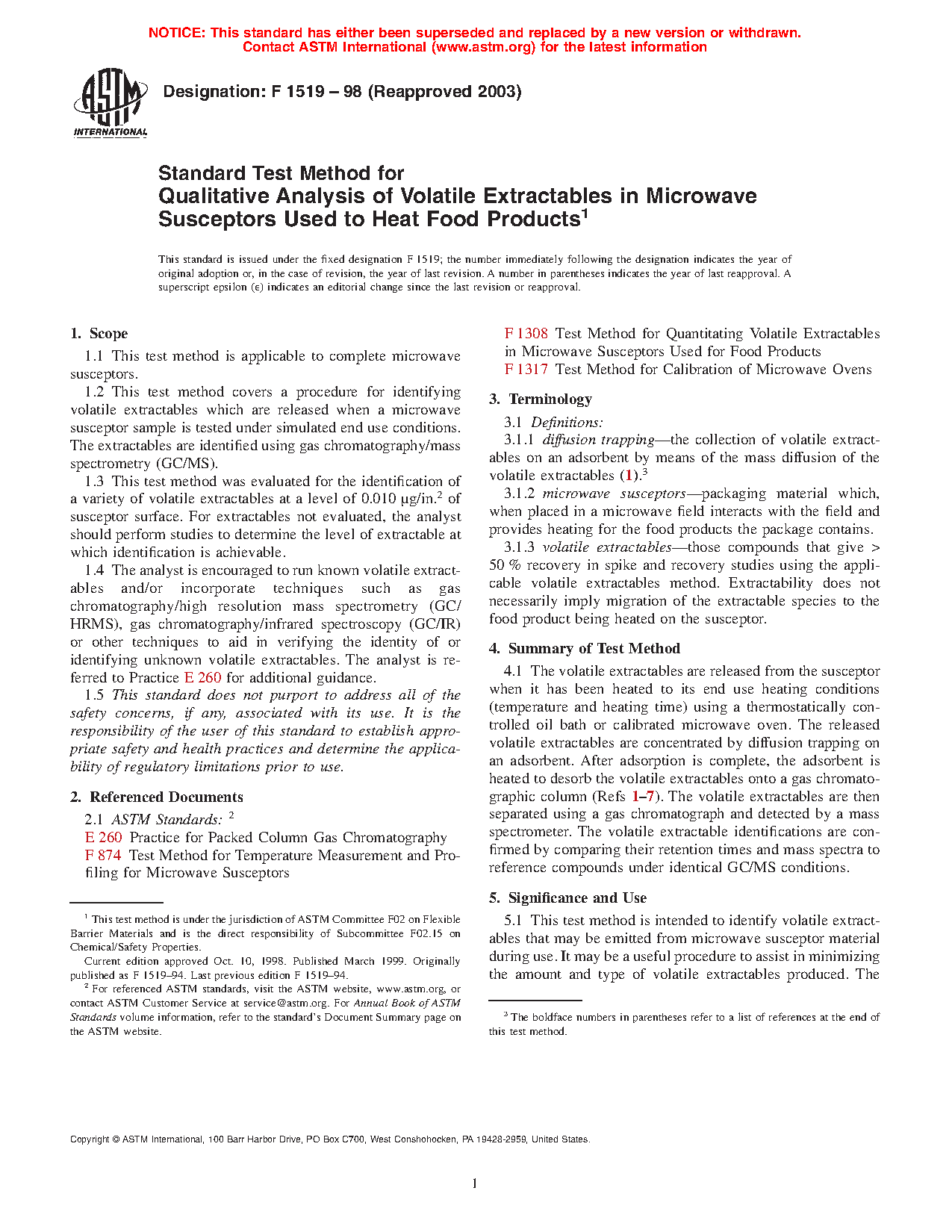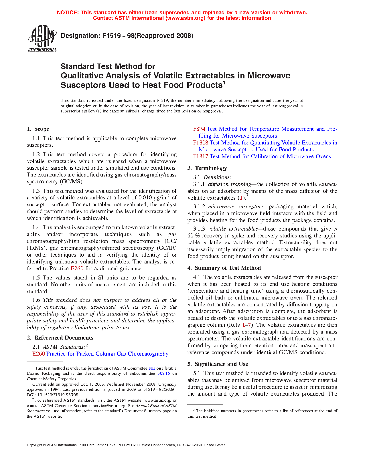 1.2 This test method covers a procedure for identifying volatile extractables which are released when a microwave susceptor sample is tested under simulated end use conditions. The extractables are identified using gas chromatography/mass spectrometry (GC/MS).