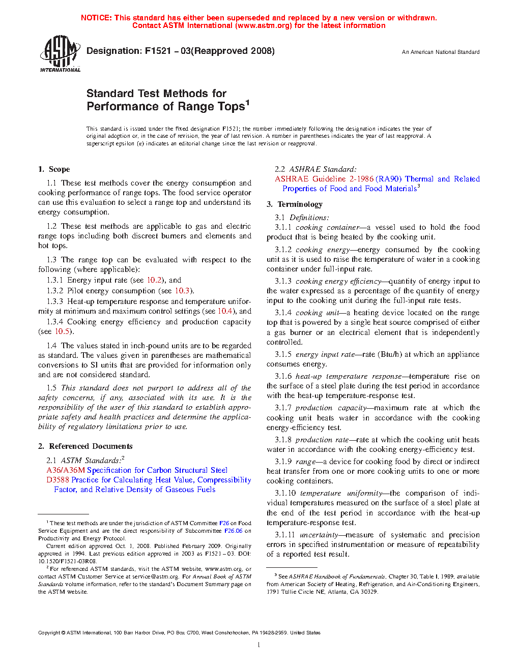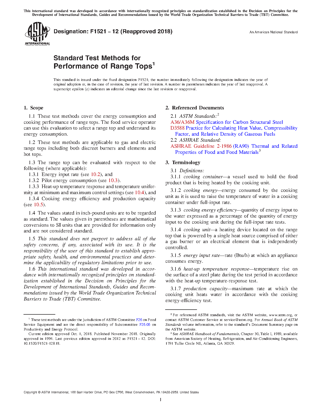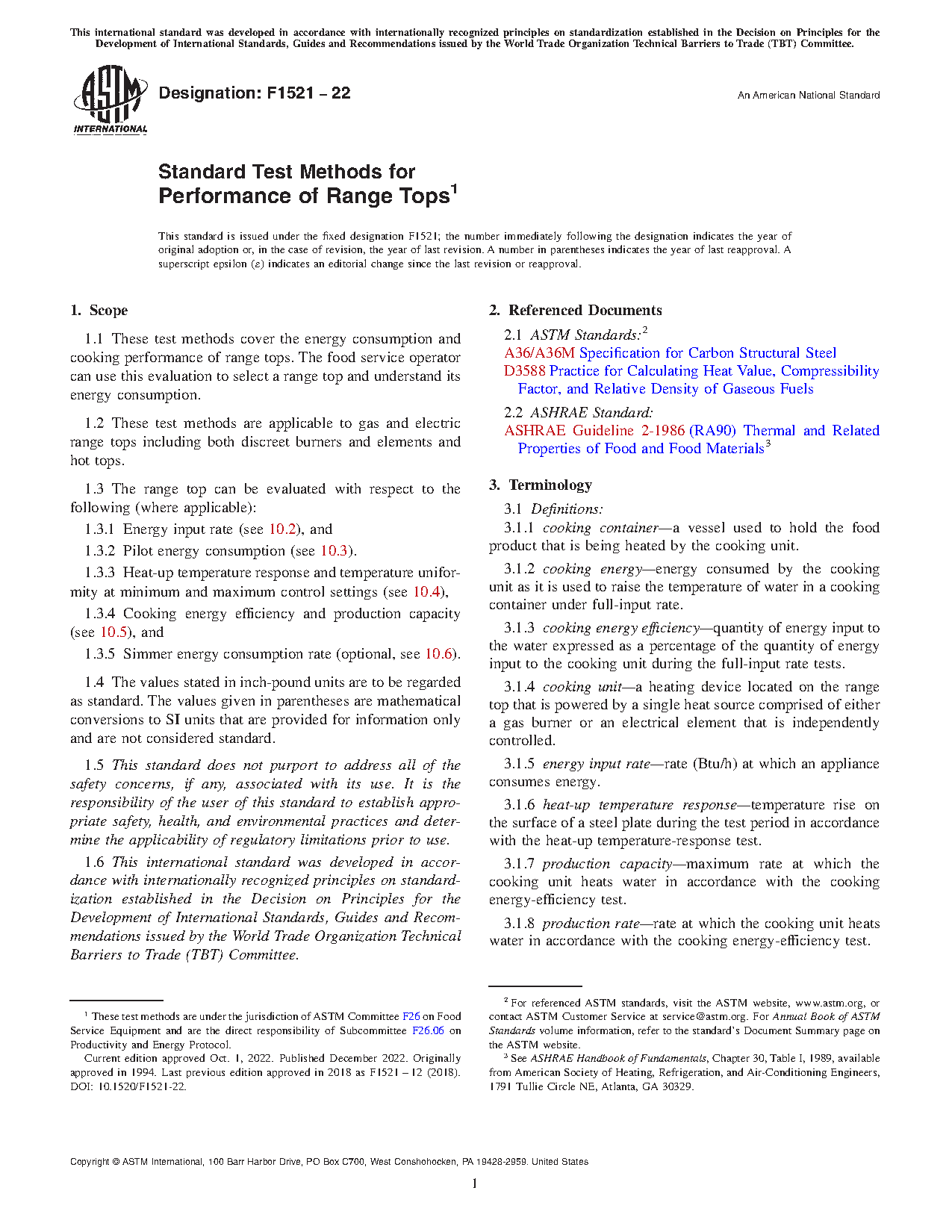 1.1 These test methods cover the energy consumption and cooking performance of range tops. The food service operator can use this evaluation to select a range top and understand its energy consumption.