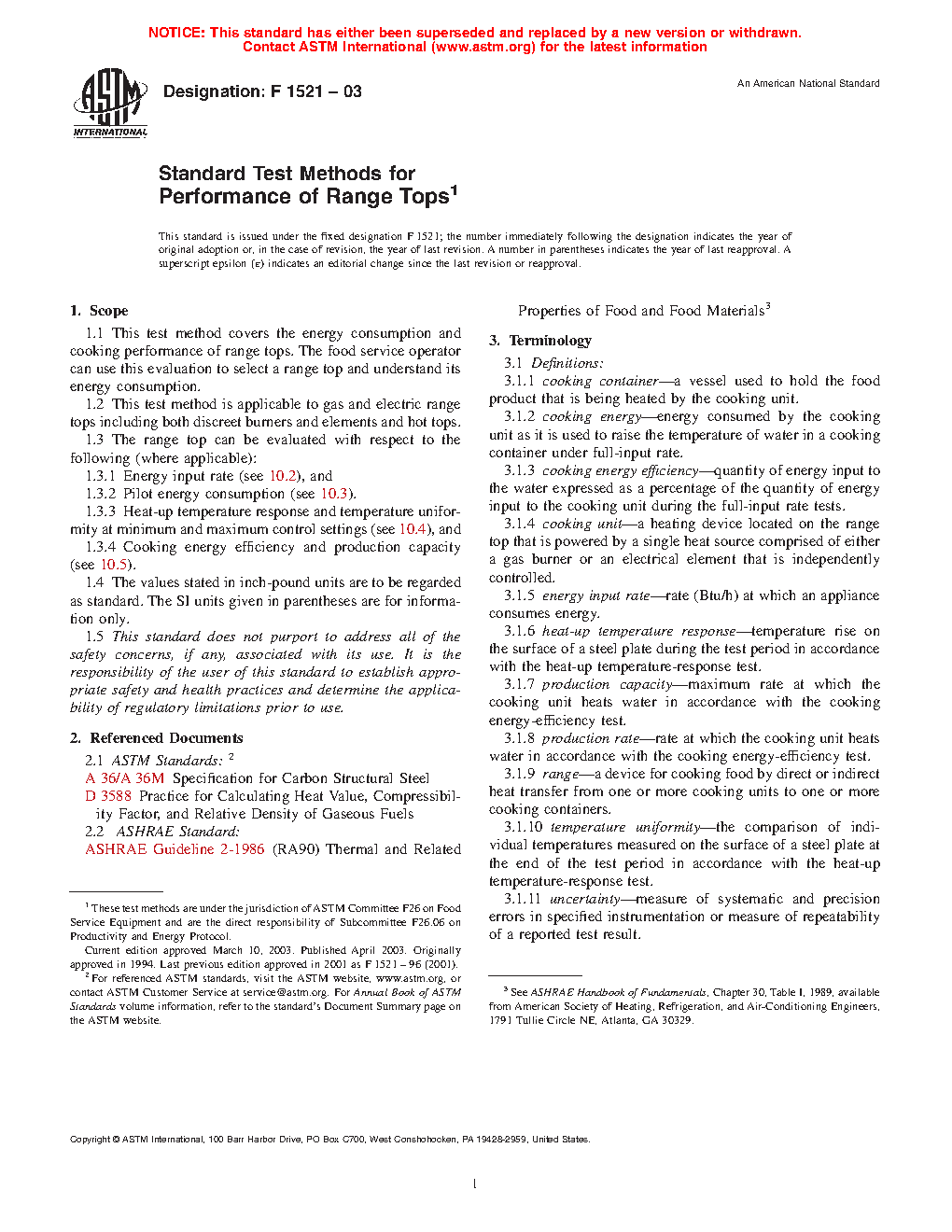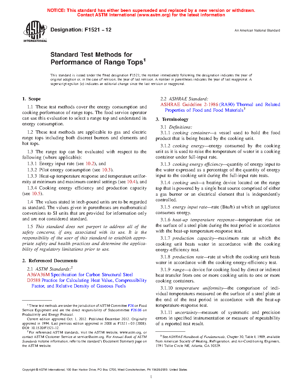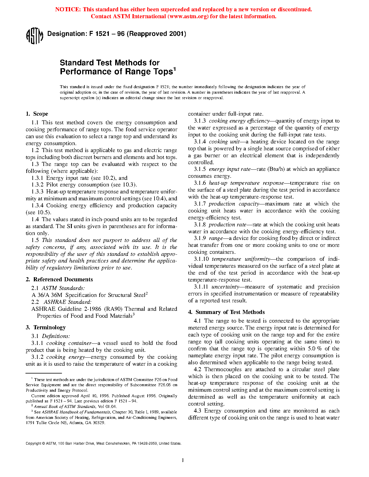 1.1 These test methods cover the energy consumption and cooking performance of range tops. The food service operator can use this evaluation to select a range top and understand its energy consumption.