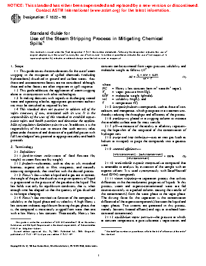 1.1 This guide covers the considerations for the use of steam stripping in the mitigation of spilled chemicals (including hydrocarbons) dissolved in ground and surface waters. Aesthetic and socioeconomic factors are not considered; although, these and other factors are often important in spill response.