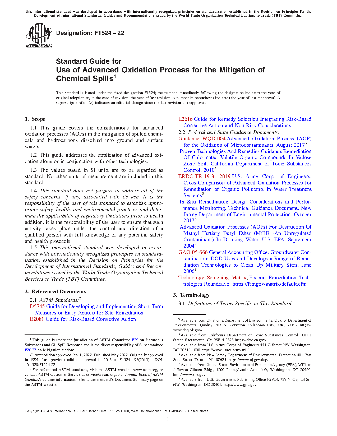 1.1 This guide covers the considerations for advanced oxidation processes (AOPs) in the mitigation of spilled chemicals and hydrocarbons dissolved into ground and surface waters.