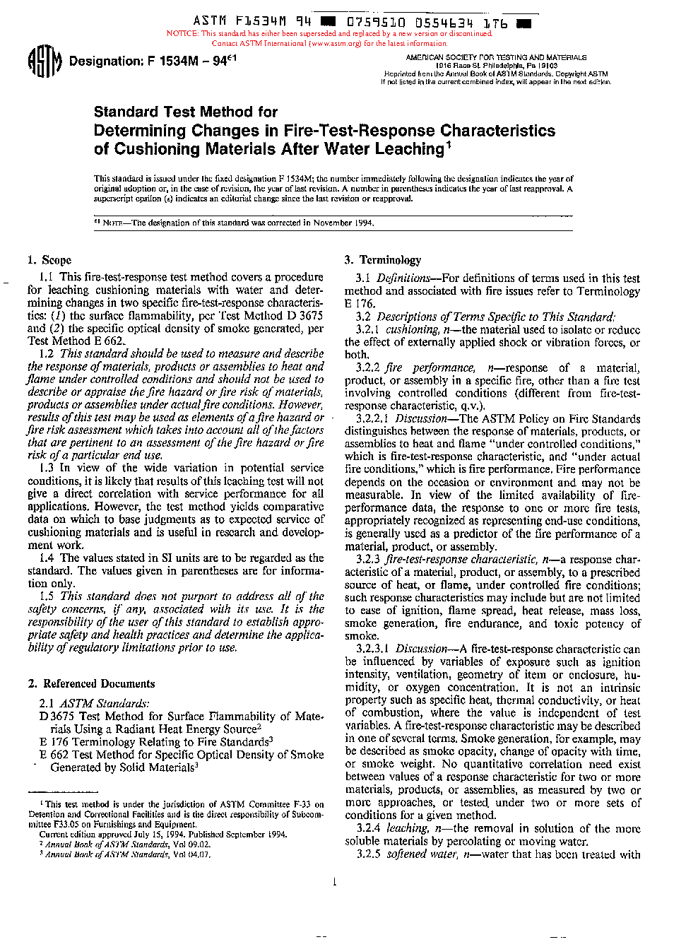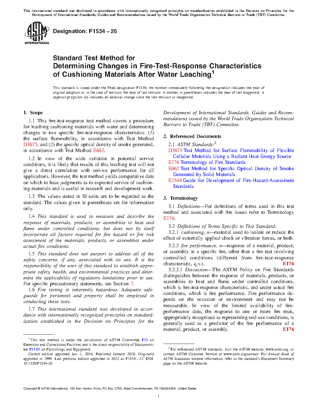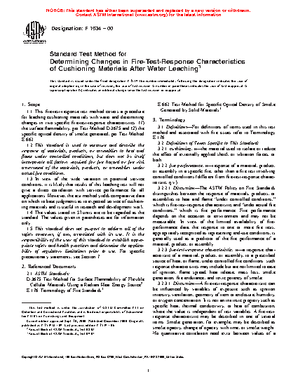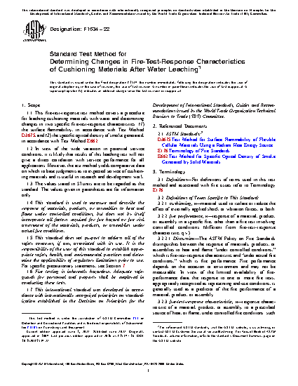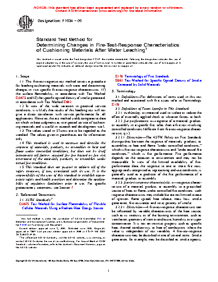 1.1 This fire-test-response test method covers a procedure for leaching cushioning materials with water and determining changes in two specific fire-test-response characteristics: (1) the surface flammability, in accordance with Test Method D3675, and (2) the specific optical density of smoke generated, in accordance with Test Method E662.